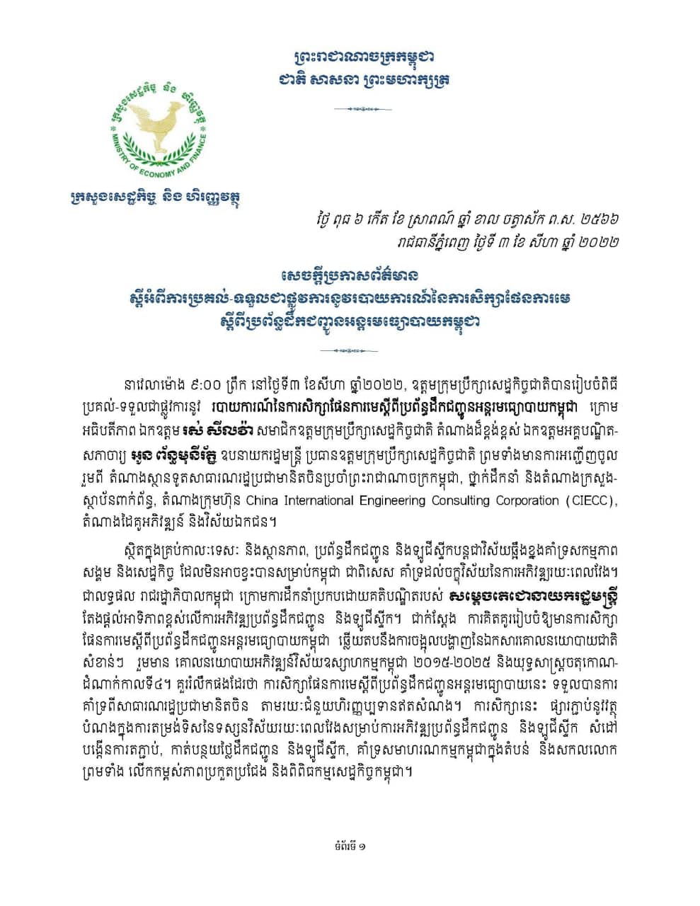 ថ្ងៃពុធ ៦កើត ខែស្រាពណ៍ ឆ្នាំខាល ចត្វាស័ក ព.ស ២៥៦៦ ត្រូវនឹងថ្ងៃទី០៣ ខែសីហា ឆ្នាំ២០២២ វេលាម៉ោង ០៩:០០នាទីព្រឹក នាឧត្តមក្រុមប្រឹក្សាសេដ្ឋកិច្ចជាតិ នៃក្រសួងសេដ្ឋកិច្ចនិងហិរញ្ញវត្ថុ ឧកញ៉ា លឹម ហេង អនុប្រធានសភាពាណិជ្ជកម្មកម្ពុជា តំណាង អ្នកឧកញ៉ា គិត ម៉េង ប្រធានសភាពាណិជ្ជកម្មកម្ពុជា បានដឹកនាំសមាជិក សមាជិកាសភាពាណិជ្ជកម្មកម្ពុជាចូលរួមក្នុងពិធី ប្រគល់-ទទួលជាផ្លូវការនូវរបាយការណ៍នៃការសិក្សា “ផែនការមេគ្រប់ជ្រុងជ្រោយស្តីពីប្រព័ន្ធដឹកជញ្ជូនអន្តរមធ្យោបាយកម្ពុជា ២០២១-២០៣០” ក្រោមអធិបតីភាព ឯកឧត្តម រស់ សីលវ៉ា សមាជិកឧត្តមក្រុមប្រឹក្សាសេដ្ឋកិច្ចជាតិ តំណាងដ៏ខ្ពង់ខ្ពស់ ឯកឧត្តមអគ្គបណ្ឌិត-សភាចារ្យ អូន ព័ន្ធមុនីរ័ត្ឋ ឧបនាយករដ្ឋមន្ត្រី ប្រធានឧត្តមក្រុមប្រឹក្សាសេដ្ឋកិច្ចជាតិ ព្រមទាំងមានការអញ្ជើញចូលរួមពី តំណាងស្ថានទូតសាធារណរដ្ឋប្រជាមានិតចិនប្រចាំព្រះរាជាណាចក្រកម្ពុជា។ កិច្ចប្រជុំនេះក៏មានការចូលរួមផងដែរពី ថ្នាក់ដឹកនាំ និងតំណាងក្រសួង-ស្ថាប័នពាក់ព័ន្ធ, តំណាងក្រុមហ៊ុន China International Engineering Consulting Corporation (CIECC), តំណាងដៃគូអភិវឌ្ឍន៍ និងផ្នែកឯកជនជាច្រើនទៀតផងដែរ។