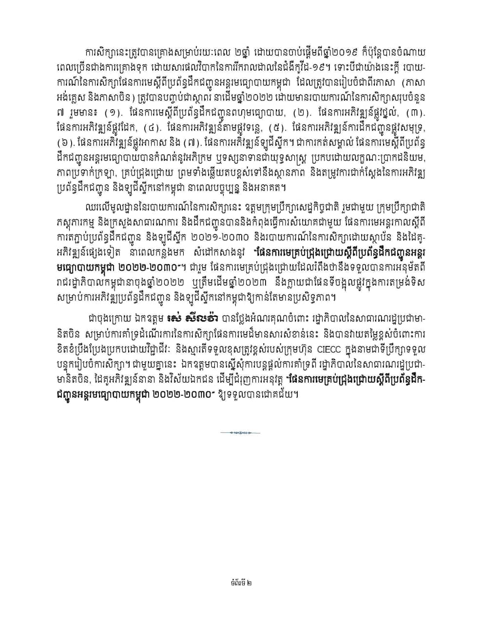 គួរបញ្ជាក់ផងដែរថា ពិធីប្រគល់-ទទួលជាផ្លូវការនូវរបាយការណ៍នៃការសិក្សា “ផែនការមេគ្រប់ជ្រុងជ្រោយស្តីពីប្រព័ន្ធដឹកជញ្ជូនអន្តរមធ្យោបាយកម្ពុជា ២០២១-២០៣០” ត្រូវបានផ្តួចផ្តើមដោយឧត្តមក្រុមប្រឹក្សាសេដ្ឋកិច្ចជាតិ ស្ថិតនៅក្រោមជំនួយហរិញ្ញប្បទានឥតសំណងពីរដ្ឋាភិបាលនៃសាធារណរដ្ឋប្រជាមានិតចិន និងសិក្សាស្រាវជ្រាវដោយឧត្តមក្រុមប្រឹក្សាសេដ្ឋកិច្ចជាតិ សហការជាមួយនឹងក្រុមការងារ CIECC និងជាពិសេសជាមួយ ដៃគូអភិវឌ្ឍន៍នានា និងវិស័យឯកជន ដើម្បីជំរុញការអនុវត្ត “ផែនការមេគ្រប់ជ្រុងជ្រោយស្តីពីប្រព័ន្ធដឹក-ជញ្ជូនអន្តរមធ្យោបាយកម្ពុជា ២០២២-២០៣០” ឱ្យទទួលបានជោគជ័យ។។
