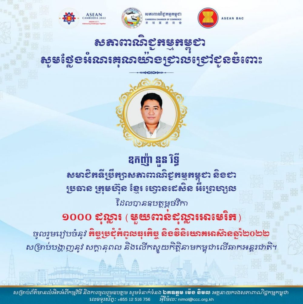 សភាពាណិជ្ជកម្មកម្ពុជា សូមថ្លែងអំណរគុណយ៉ាងជ្រាលជ្រៅជូនចំពោះ ឧកញ៉ា នួន រិទ្ធី សមាជិកទីប្រឹក្សាសភាពាណិជ្ជកម្មកម្ពុជា និងជា ប្រធានក្រុមហ៊ុន ខ្មែរ ហ្វោនដេសិន អឹព្រេហ្សល ដែលបានឧបត្ថម្ភថវិកា ១០០០ ដុល្លារ ចូលរួមរៀបចំ កិច្ចប្រជុំកំពូលធុរកិច្ច និងវិនិយោគអាស៊ានឆ្នាំ២០២២ ដែលជាកម្លាំងសាមគ្គីក្នុងការរួមចំណែកលើកស្ទួយកិត្តិនាមកម្ពុជាលើឆាកអន្តរជាតិ។