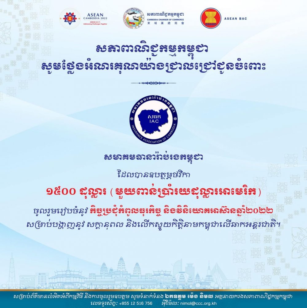 សភាពាណិជ្ជកម្មកម្ពុជា សូមថ្លែងអំណរគុណយ៉ាងជ្រាលជ្រៅជូនចំពោះ សមាគមធានារ៉ាប់រងកម្ពុជា ដែលបានឧបត្ថម្ភថវិកា ១៥០០ ដុល្លារ ចូលរួមរៀបចំ កិច្ចប្រជុំកំពូលធុរកិច្ច និងវិនិយោគអាស៊ានឆ្នាំ២០២២ ដែលជាកម្លាំងសាមគ្គីក្នុងការរួមចំណែកលើកស្ទួយកិត្តិនាមកម្ពុជាលើឆាកអន្តរជាតិ។