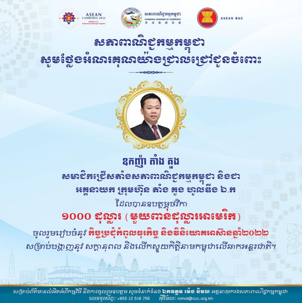 សភាពាណិជ្ជកម្មកម្ពុជា សូមថ្លែងអំណរគុណយ៉ាងជ្រាលជ្រៅជូនចំពោះ ឧកញ៉ា តាំង គួង សមាជិកជ្រើសតាំងសភាពាណិជ្ជកម្មកម្ពុជា និងជា អគ្គនាយក ក្រុមហ៊ុន តាំង គួង ហូលឌីង ឯ.ក ដែលបានឧបត្ថម្ភថវិកា ១០០០ ដុល្លារ ចូលរួមរៀបចំ កិច្ចប្រជុំកំពូលធុរកិច្ច និងវិនិយោគអាស៊ានឆ្នាំ២០២២ ដែលជាកម្លាំងសាមគ្គីក្នុងការរួមចំណែកលើកស្ទួយកិត្តិនាមកម្ពុជាលើឆាកអន្តរជាតិ។