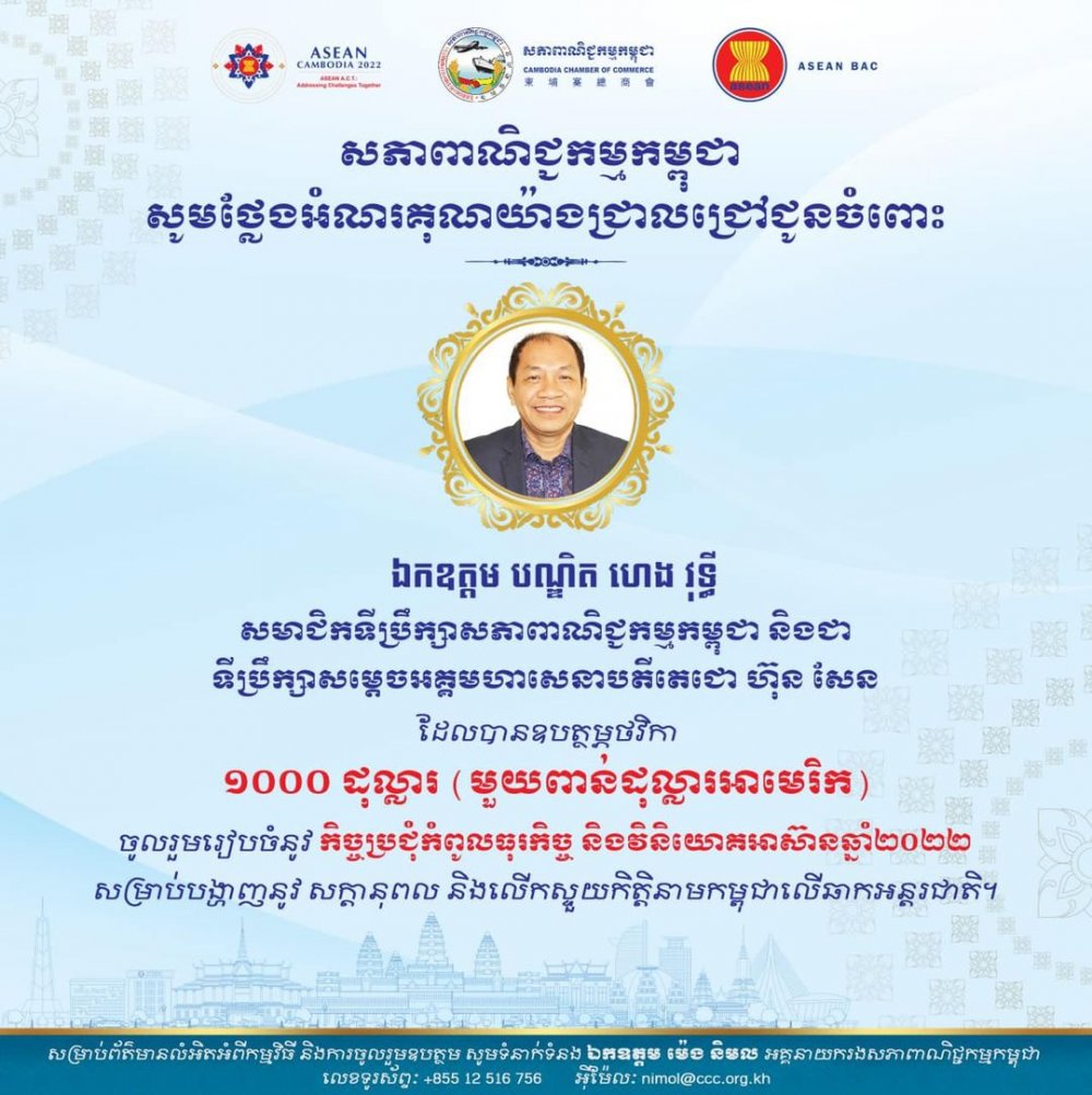 សភាពាណិជ្ជកម្មកម្ពុជា សូមថ្លែងអំណរគុណយ៉ាងជ្រាលជ្រៅជូនចំពោះ ឯកឧត្តម បណ្ឌិត ហេង វុទ្ធី សមាជិកទីប្រឹក្សាសភាពាណិជ្ជកម្មកម្ពុជា និងជា ទីប្រឹក្សាសម្តេចអគ្គមហាសេនាបតីតេជោ ហ៊ុន សែន ដែលបានឧបត្ថម្ភថវិកា ១០០០ ដុល្លារ ចូលរួមរៀបចំ កិច្ចប្រជុំកំពូលធុរកិច្ច និងវិនិយោគអាស៊ានឆ្នាំ២០២២ ដែលជាកម្លាំងសាមគ្គីក្នុងការរួមចំណែកលើកស្ទួយកិត្តិនាមកម្ពុជាលើឆាកអន្តរជាតិ។