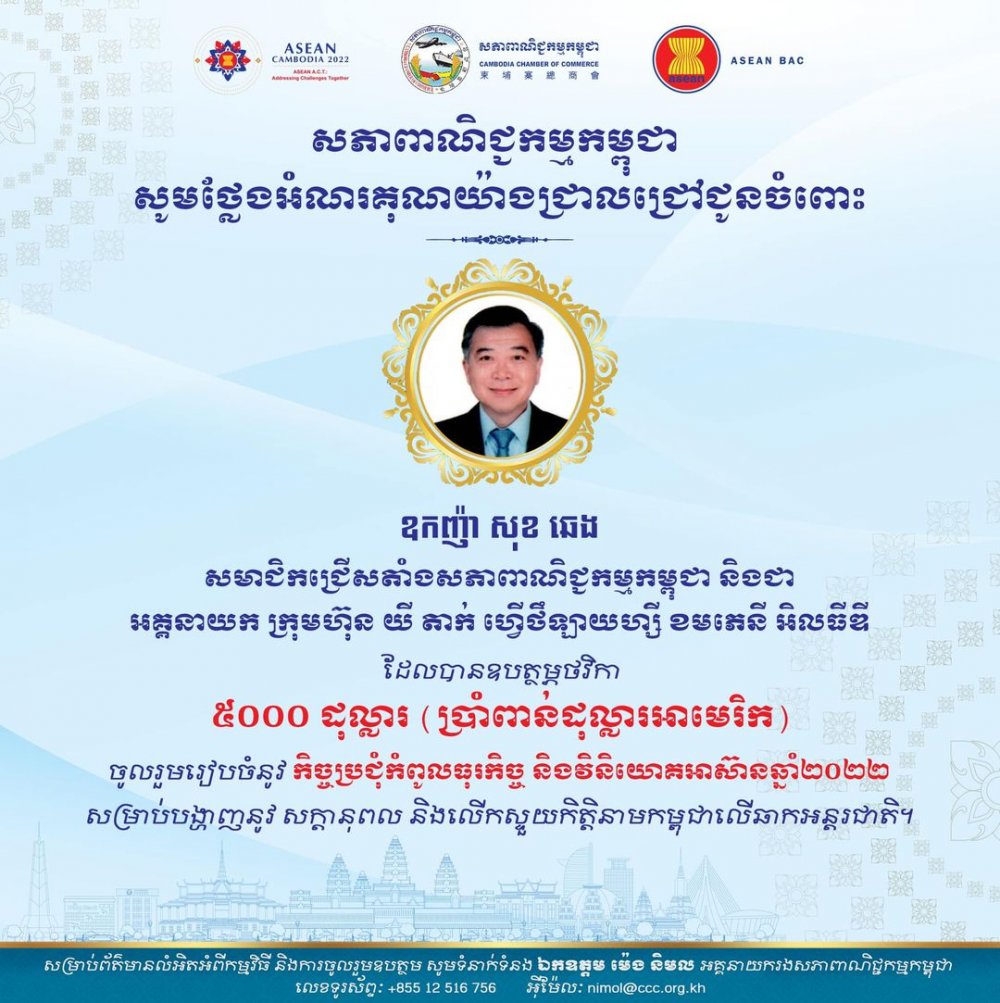សភាពាណិជ្ជកម្មកម្ពុជា សូមថ្លែងអំណរគុណយ៉ាងជ្រាលជ្រៅជូនចំពោះ ឧកញ៉ា សុខ ឆេង សមាជិកជ្រើសតាំងសភាពាណិជ្ជកម្មកម្ពុជា និងជា អគ្គនាយក ក្រុមហ៊ុន យី តាក់ ហ្វើថឹឡាយហ្សី ខមភេនី អិលធីឌី ដែលបានឧបត្ថម្ភថវិកា ៥០០០ ដុល្លារ ចូលរួមរៀបចំ កិច្ចប្រជុំកំពូលធុរកិច្ច និងវិនិយោគអាស៊ានឆ្នាំ២០២២ ដែលជាកម្លាំងសាមគ្គីក្នុងការរួមចំណែកលើកស្ទួយកិត្តិនាមកម្ពុជាលើឆាកអន្តរជាតិ។