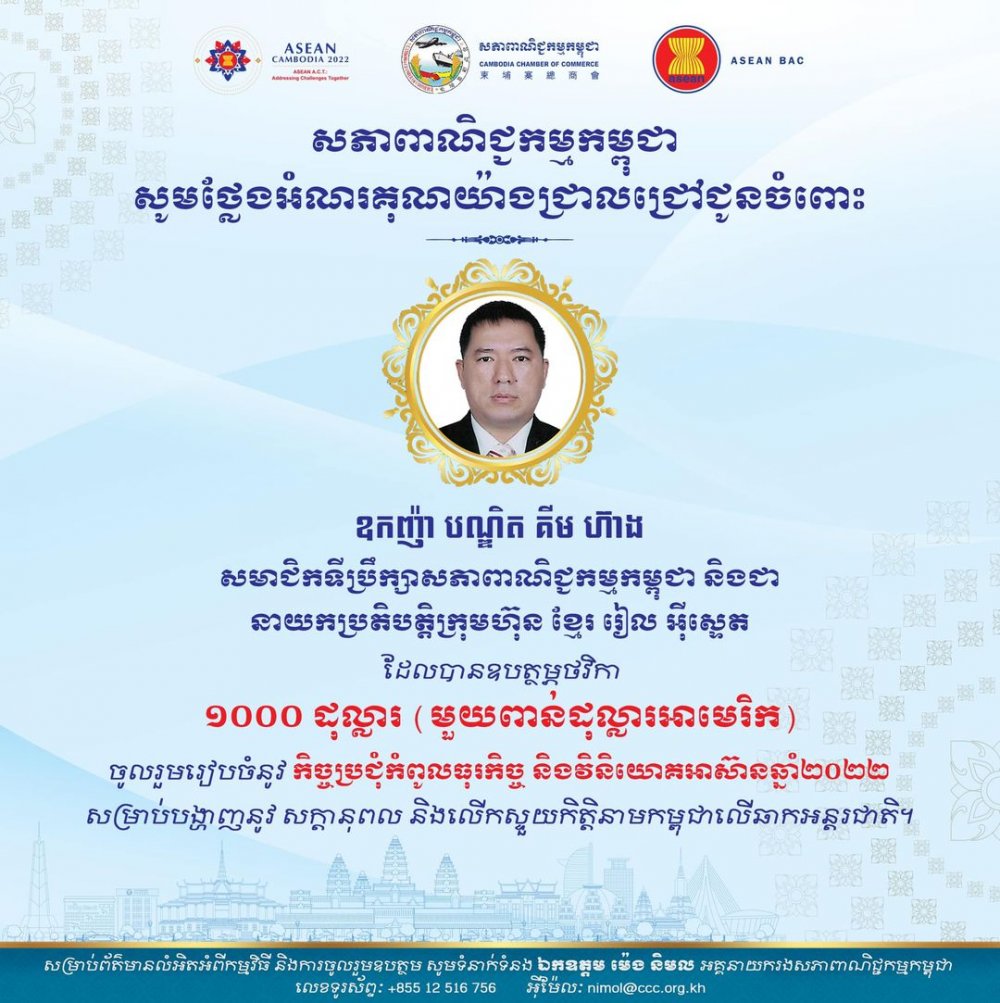 សភាពាណិជ្ជកម្មកម្ពុជា សូមថ្លែងអំណរគុណយ៉ាងជ្រាលជ្រៅជូនចំពោះ ឧកញ៉ា បណ្ឌិត គីម ហ៊ាង សមាជិកទីប្រឹក្សាសភាពាណិជ្ជកម្មកម្ពុជា និងជា នាយក ប្រតិបត្តិ ក្រុមហ៊ុន ខ្មែរ រៀល អុីស្ទេត ដែលបានឧបត្ថម្ភថវិកា ១០០០ ដុល្លារ ចូលរួមរៀបចំ កិច្ចប្រជុំកំពូលធុរកិច្ច និងវិនិយោគអាស៊ានឆ្នាំ២០២២ ដែលជាកម្លាំងសាមគ្គីក្នុងការរួមចំណែកលើកស្ទួយកិត្តិនាមកម្ពុជាលើឆាកអន្តរជាតិ។