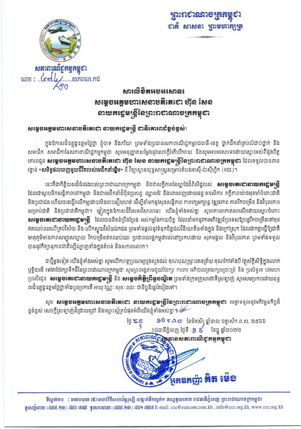 សារលិខិតអបអរសាទរ អ្នកឧកញ៉ា គិត ម៉េង ប្រធានសភាពាណិជ្ជកម្មកម្ពុជា និង លោកជំទាវ ម៉ៅ ចំណាន ព្រមទាំងប្រធានសភាពាណិជ្ជកម្មរាជធានី-ខេត្ត ថ្នាក់ដឹកនាំគ្រប់លំដាប់ថ្នាក់ និងសមាជិក សមាជិកានៃសភាពាណិជ្ជកម្មកម្ពុជា គោរពជូន សម្តេចអគ្គមហាសេនាបតីតេជោ ហ៊ុន សែន នាយករដ្ឋមន្ត្រីនៃព្រះរាជាណាចក្រកម្ពុជា ដែលទទួលបានពានរង្វាន់ «សមិទ្ធផលពេញមួយជីវិតរបស់មេដឹកនាំឆ្នើម» ពី វិទ្យាស្ថានយុទ្ធសាស្ត្រសម្រាប់តំបន់អាស៊ី-ប៉ាស៊ីហ្វិក (KSI)។