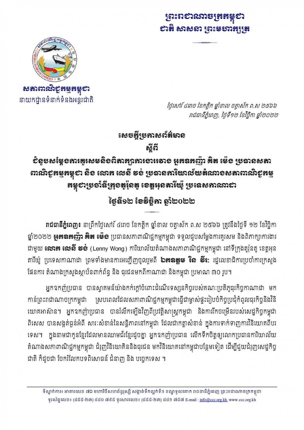 រាជធានីភ្នំពេញ៖ នាព្រឹកថ្ងៃសៅរ៍ ៤រោច ខែកត្តិក ឆ្នាំខាល ចត្វាស័ក ព.ស ២៥៦៦ ត្រូវនឹងថ្ងៃទី ១២ ខែវិច្ឆិកា ឆ្នាំ២០២២ អ្នកឧកញ៉ា គិត ម៉េង ប្រធានសភាពាណិជ្ជកម្មកម្ពុជា ទទួលជួបសម្តែងការគួរសម និងពិភាក្សាការងារជាមួយ លោក លេនី វង់ (Lenny Wong) ការិយាល័យតំណាងសភាពាណិជ្ជកម្មកម្ពុជា នៅទីក្រុងតូរ៉ុនតូ ខេត្តអុនតារីយ៉ូ ប្រទេសកាណាដា ព្រមទាំងមានការអញ្ជើញចូលរួមពី ឯកឧត្តម រិន វីរៈ រដ្ឋលេខាធិការប្រចាំការក្រសួងផែនការ តំណាងក្រសួងស្ថាប័នពាក់ព័ន្ធ និង ធុរជនមកពីកាណាដា និងកម្ពុជា ប្រមាណ ៣០ រូប។