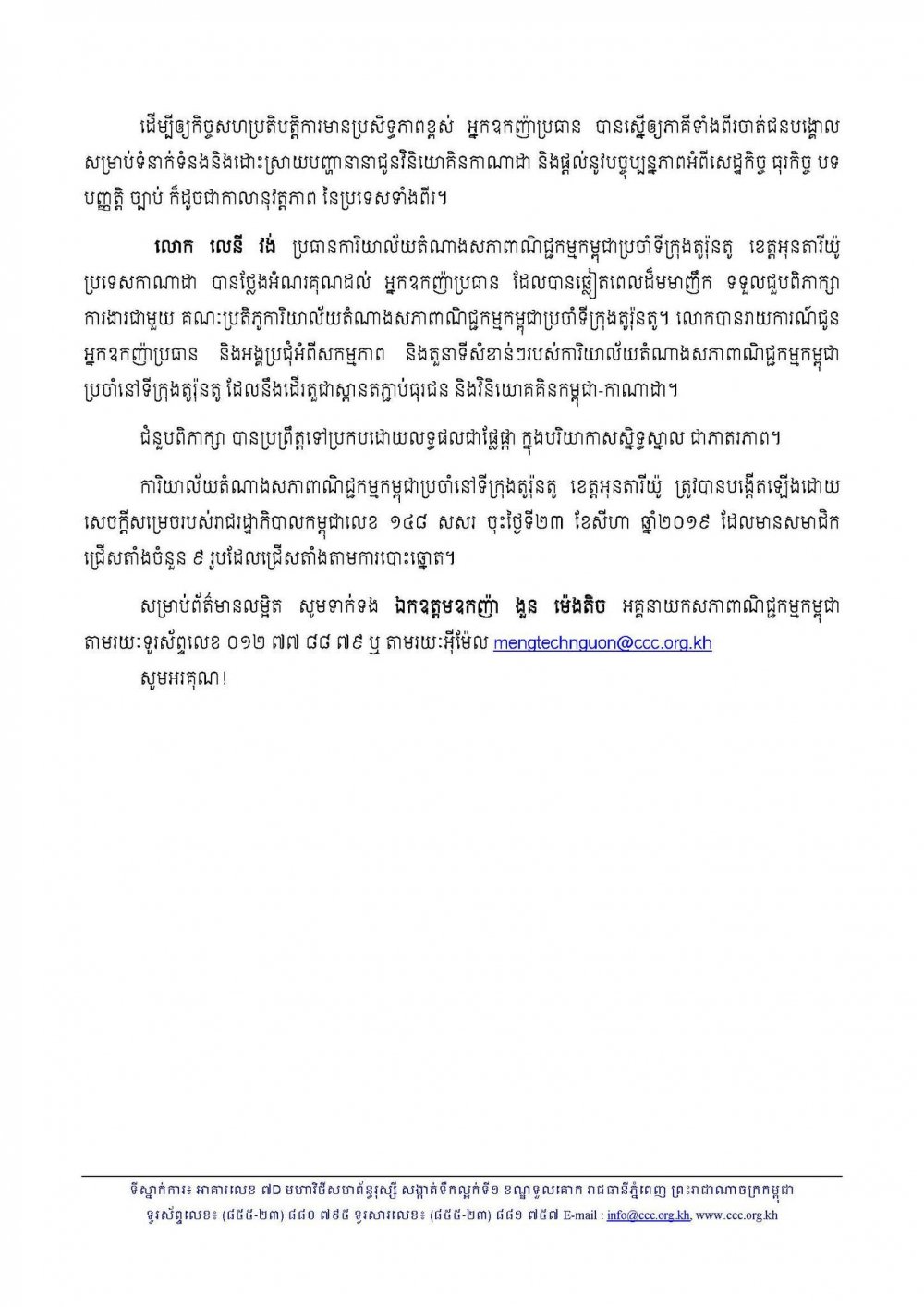ការិយាល័យតំណាងសភាពាណិជ្ជកម្មកម្ពុជាប្រចាំនៅទីក្រុងតូរ៉ុនតូ ខេត្តអុនតារីយ៉ូ ត្រូវបានបង្កើតឡើងដោយសេចក្តីសម្រេចរបស់រាជរដ្ឋាភិបាលកម្ពុជាលេខ ១៤៨ សសរ ចុះថ្ងៃទី២៣ ខែសីហា ឆ្នាំ២០១៩ ដែលមានសមាជិកជ្រើសតាំងចំនួន ៩ រូបដែលជ្រើសតាំងតាមការបោះឆ្នោត។