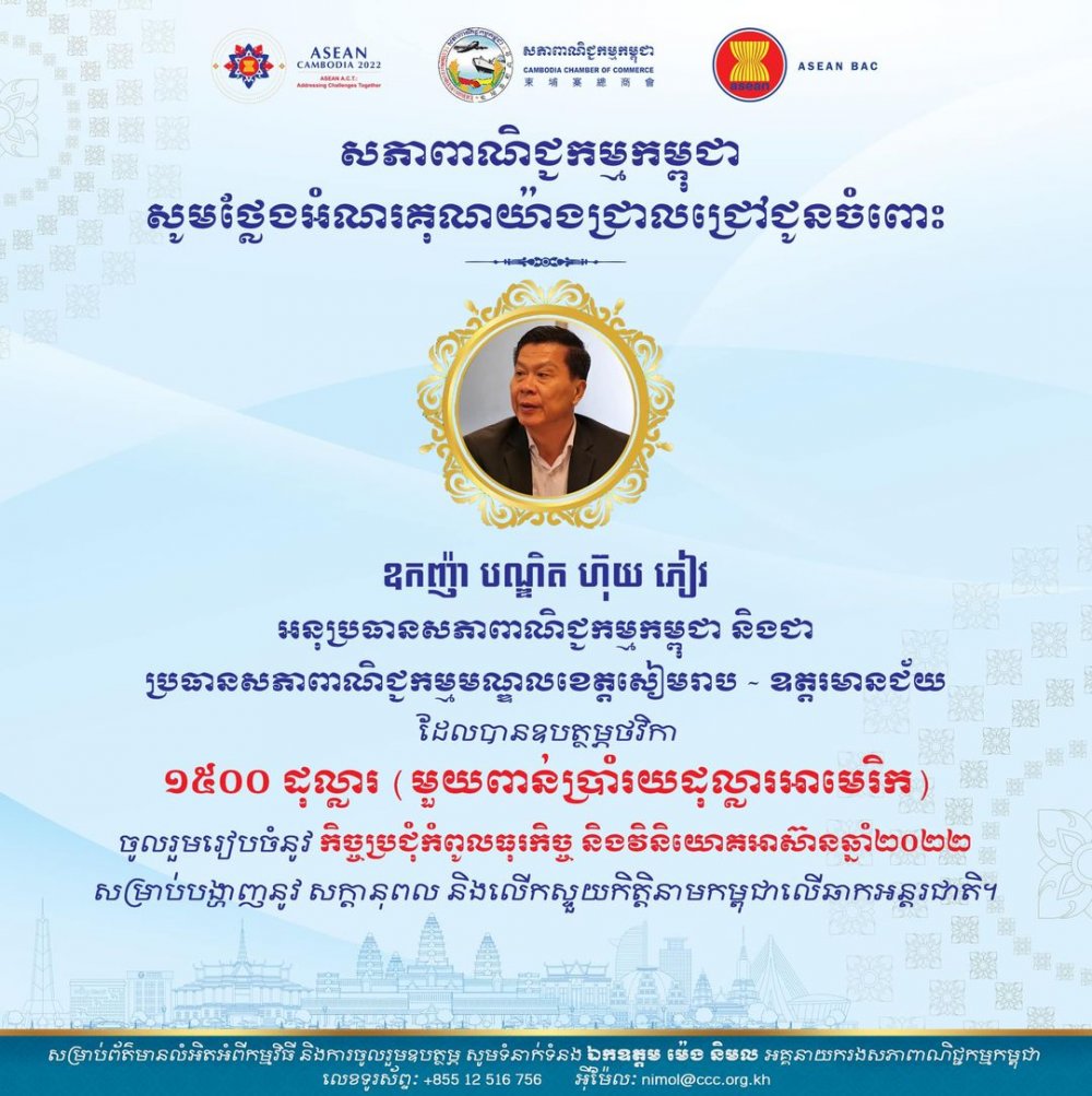 សភាពាណិជ្ជកម្មកម្ពុជា សូមថ្លែងអំណរគុណយ៉ាងជ្រាលជ្រៅជូនចំពោះ ឧកញ៉ា បណ្ឌិត ហ៊ុយ ភៀវ អនុប្រធានសភាពាណិជ្ជកម្មកម្ពុជា និងជា ប្រធានសភាពាណិជ្ជកម្មមណ្ឌលខេត្ត​សៀមរាប - ឧត្តរមានជ័យ ដែលបានឧបត្ថម្ភថវិកា ១៥០០ ដុល្លារ ចូលរួមរៀបចំ កិច្ចប្រជុំកំពូលធុរកិច្ច និងវិនិយោគអាស៊ានឆ្នាំ២០២២ ដែលជាកម្លាំងសាមគ្គីក្នុងការរួមចំណែកលើកស្ទួយកិត្តិនាមកម្ពុជាលើឆាកអន្តរជាតិ។