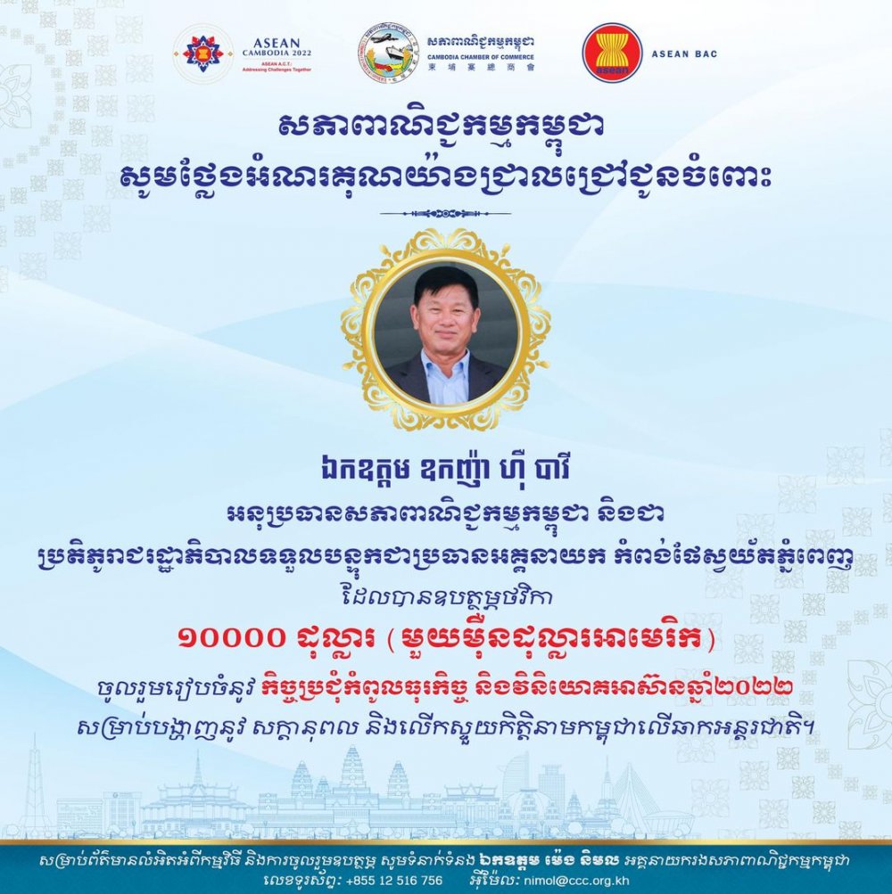 សភាពាណិជ្ជកម្មកម្ពុជា សូមថ្លែងអំណរគុណយ៉ាងជ្រាលជ្រៅជូនចំពោះ ឯកឧត្តម ឧកញ៉ា ហុឺ បាវី អនុប្រធានសភាពាណិជ្ជកម្មកម្ពុជា និងជាប្រតិភូរាជរដ្ឋាភិបាលទទួលបន្ទុកជាប្រធានអគ្គនាយក កំពង់ផែស្វយ័តភ្នំពេញ និងបុគ្គលិកទាំងអស់ដែលបានឧបត្ថម្ភថវិកា ១០០០០ ដុល្លារ ចូលរួមរៀបចំ កិច្ចប្រជុំកំពូលធុរកិច្ច និងវិនិយោគអាស៊ានឆ្នាំ២០២២ ដែលជាកម្លាំងសាមគ្គីក្នុងការរួមចំណែកលើកស្ទួយកិត្តិនាមកម្ពុជាលើឆាកអន្តរជាតិ។