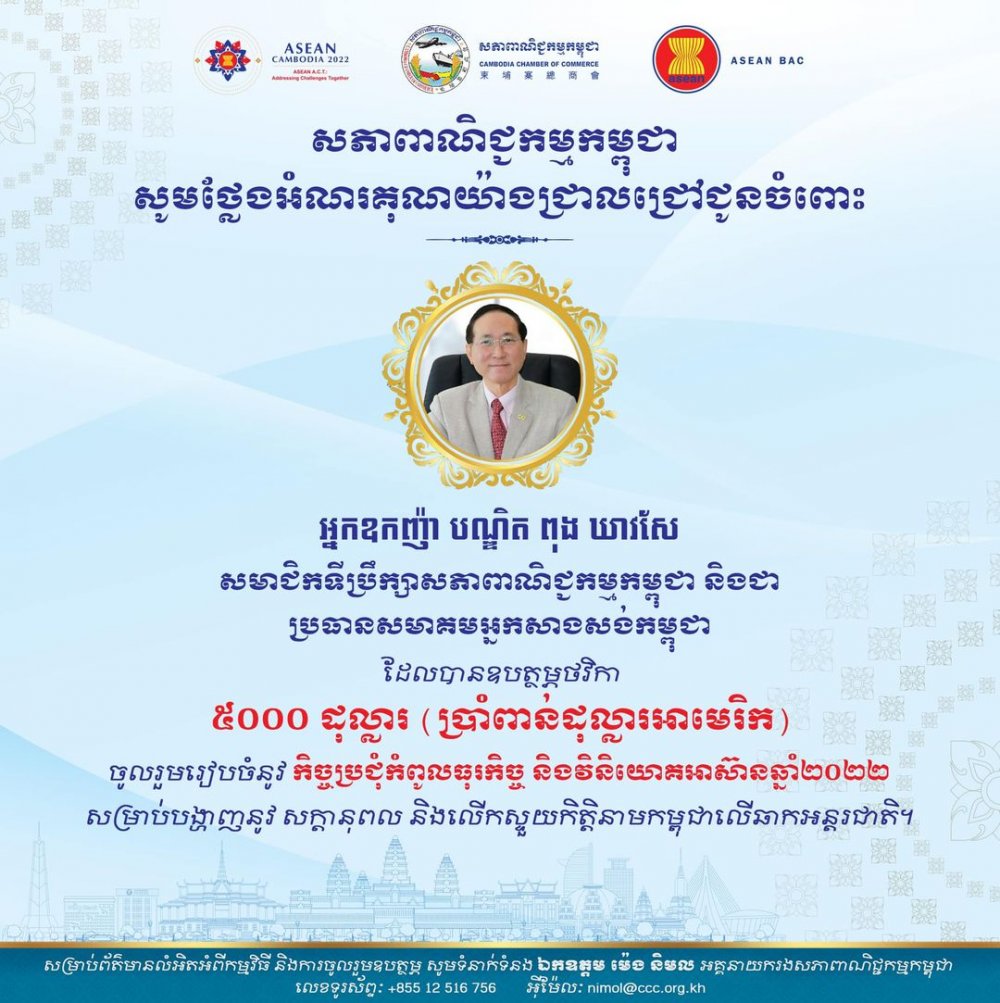 សភាពាណិជ្ជកម្មកម្ពុជា សូមថ្លែងអំណរគុណយ៉ាងជ្រាលជ្រៅជូនចំពោះ អ្នកឧកញ៉ា បណ្ឌិត ពុង ឃាវសែ សមាជិកទីប្រឹក្សាសភាពាណិជ្ជកម្មកម្ពុជា និងជា ប្រធានសមាគមអ្នកសាងសង់កម្ពុជា ដែលបានឧបត្ថម្ភថវិកា ៥០០០ ដុល្លារ ចូលរួមរៀបចំ កិច្ចប្រជុំកំពូលធុរកិច្ច និងវិនិយោគអាស៊ានឆ្នាំ២០២២ ដែលជាកម្លាំងសាមគ្គីក្នុងការួមចំណែក លើកស្ទួយកិត្តិនាមកម្ពុជាលើឆាកអន្តរជាតិ។