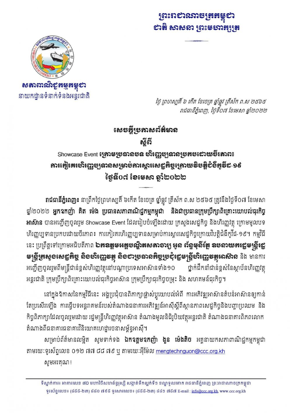 រាជធានីភ្នំពេញ៖ នាព្រឹកថ្ងៃព្រហស្បតិ៍ ៦កើត ខែចេត្រ ឆ្នាំឆ្លូវ ត្រីស័ក ព.ស ២៥៦៥ ត្រូវនឹងថ្ងៃទី០៧ ខែមេសា ឆ្នាំ២០២២ អ្នកឧកញ៉ា គិត ម៉េង ប្រធានសភាពាណិជ្ជកម្មកម្ពុជា និងជាប្រធានក្រុមប្រឹក្សាពិគ្រោះយោបល់ធុរកិច្ច អាស៊ាន បានអញ្ជើញចូលរួម Showcase Event ដែលរៀបចំឡើងដោយ ក្រសួងសេដ្ឋកិច្ច និងហិរញ្ញវត្ថុ ក្រោមមូលបទ ហិរញ្ញប្បទានប្រកបដោយចីរភាព៖ ការកៀរគរហិរញ្ញប្បទានសម្រាប់ការស្តារសេដ្ឋកិច្ចក្រោយវិបត្តិជំងឺកូវីដ-១៩។ កម្មវិធីនេះ ប្រព្រឹត្តទៅក្រោមអធិបតីភាព ឯកឧត្តមអគ្គបណ្ឌិតសភាចារ្យ អូន ព័ន្ធមុនីរ័ត្ន ឧបនាយករដ្ឋមន្រ្តីរដ្ឋមន្រ្តីក្រសួងសេដ្ឋកិច្ច និងហិរញ្ញវត្ថុ និងជាប្រធានកិច្ចប្រជុំរដ្ឋមន្ត្រីហិរញ្ញវត្ថុអាស៊ាន និង មានការអញ្ជើញចូលរួមពីមន្ត្រីជាន់ខ្ពស់ហិរញ្ញវត្ថុនៅបណ្តាប្រទេសអាស៊ានទាំង១០ ថ្នាក់ដឹកនាំជាន់ខ្ពស់នៃស្ថាប័នហិរញ្ញវត្ថុ អន្តរជាតិ ក្រុមប្រឹក្សាពិគ្រោះយោបល់ធុរកិច្ចអាស៊ាន ក្រុមប្រឹក្សាធុរកិច្ចចម្រុះ និង សហគមន៍ធុរកិច្ច។
