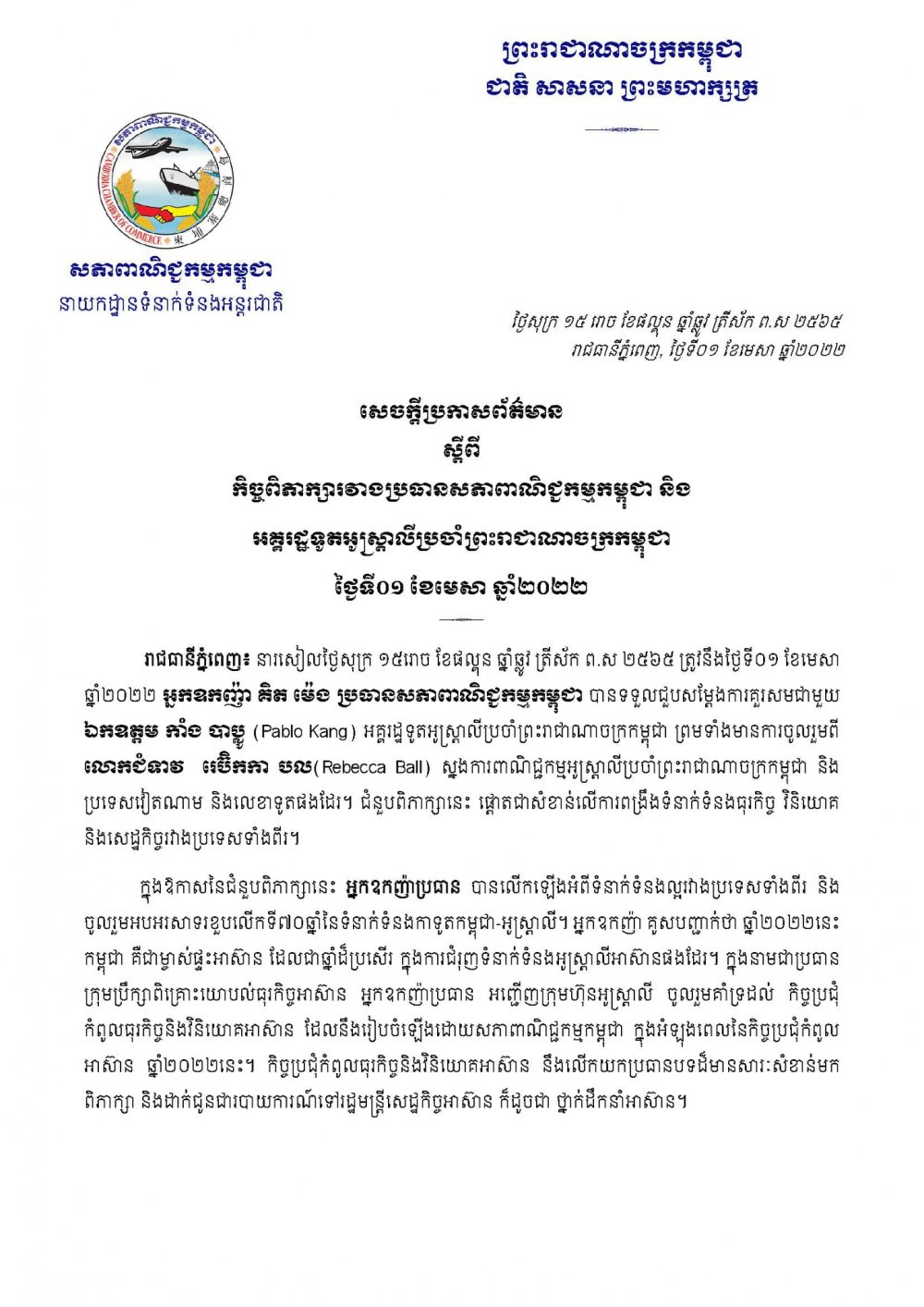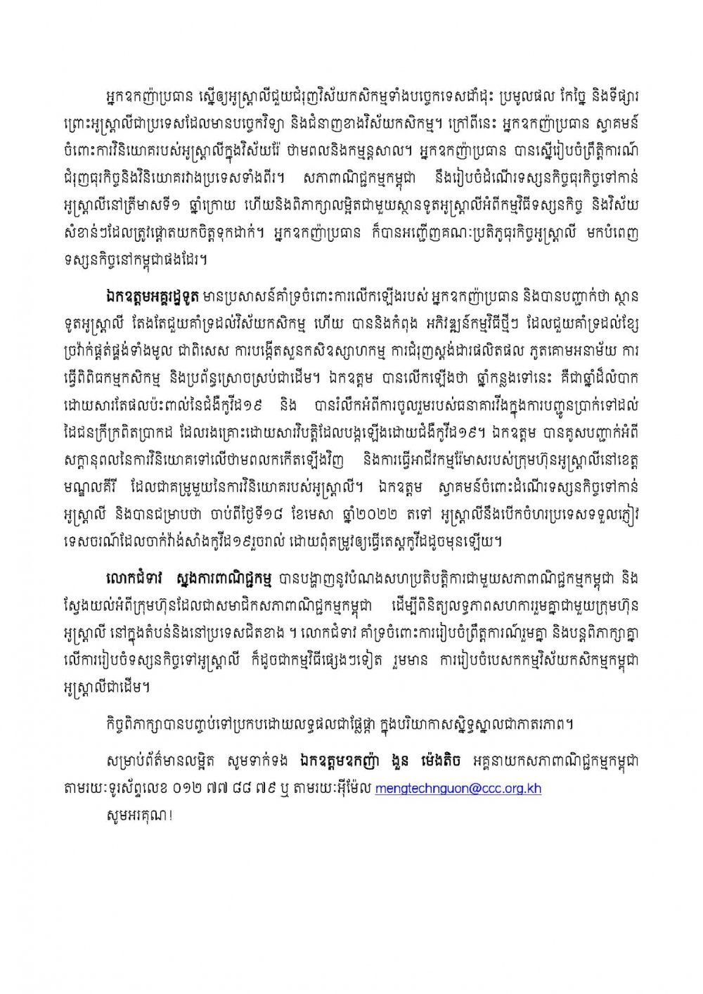 រាជធានីភ្នំពេញ៖ នារសៀលថ្ងៃសុក្រ ១៥រោច ខែផល្គុន ឆ្នាំឆ្លូវ ត្រីស័ក ព.ស ២៥៦៥ ត្រូវនឹងថ្ងៃទី០១ ខែមេសា ឆ្នាំ២០២២ អ្នកឧកញ៉ា គិត ម៉េង ប្រធានសភាពាណិជ្ជកម្មកម្ពុជា បានទទួលជួបសម្តែងការគួរសមជាមួយ ឯកឧត្តម កាំង បាប្លូ (Pablo Kang) អគ្គរដ្ឋទូតអូស្ត្រាលីប្រចាំព្រះរាជាណាចក្រកម្ពុជា ព្រមទាំងមានការចូលរួមពី លោកជំទាវ រេប៊ិកកា បល(Rebecca Ball) ស្នងការពាណិជ្ជកម្មអូស្ត្រាលីប្រចាំព្រះរាជាណាចក្រកម្ពុជា និងប្រទេសវៀតណាម និងលេខាទូតផងដែរ។ ជំនួបពិភាក្សានេះ ផ្តោតជាសំខាន់លើការពង្រឹងទំនាក់ទំនងធុរកិច្ច វិនិយោគ និងសេដ្ឋកិច្ចរវាងប្រទេសទាំងពីរ។