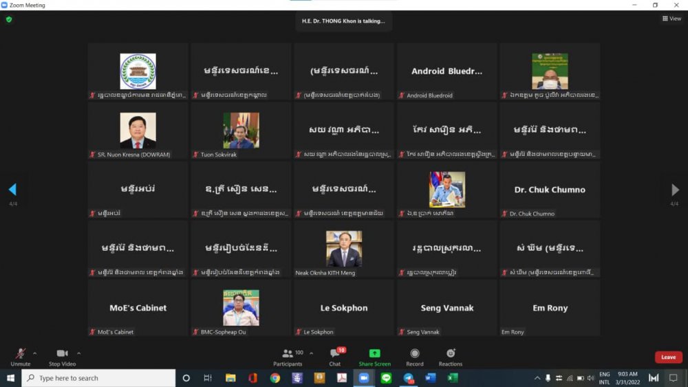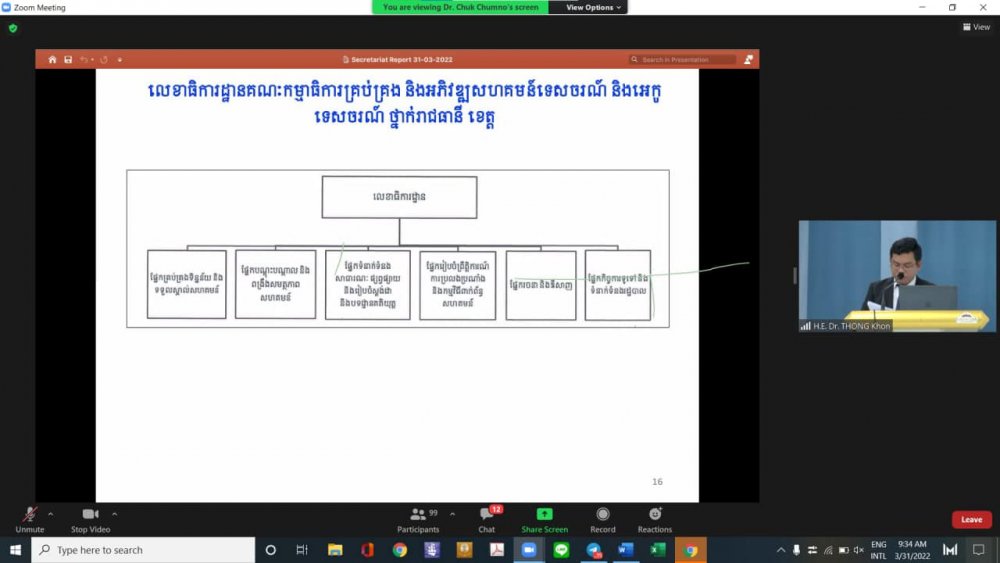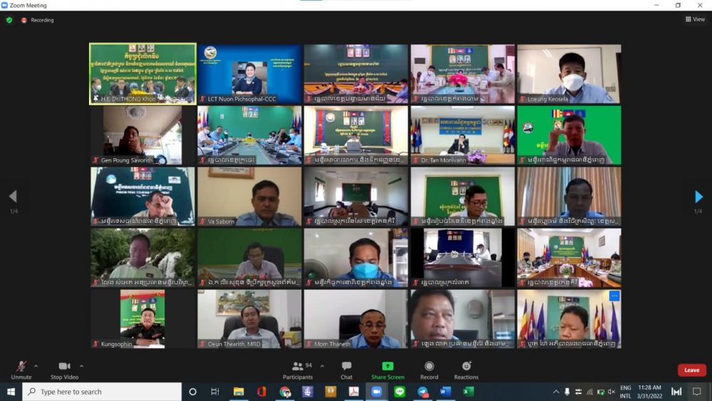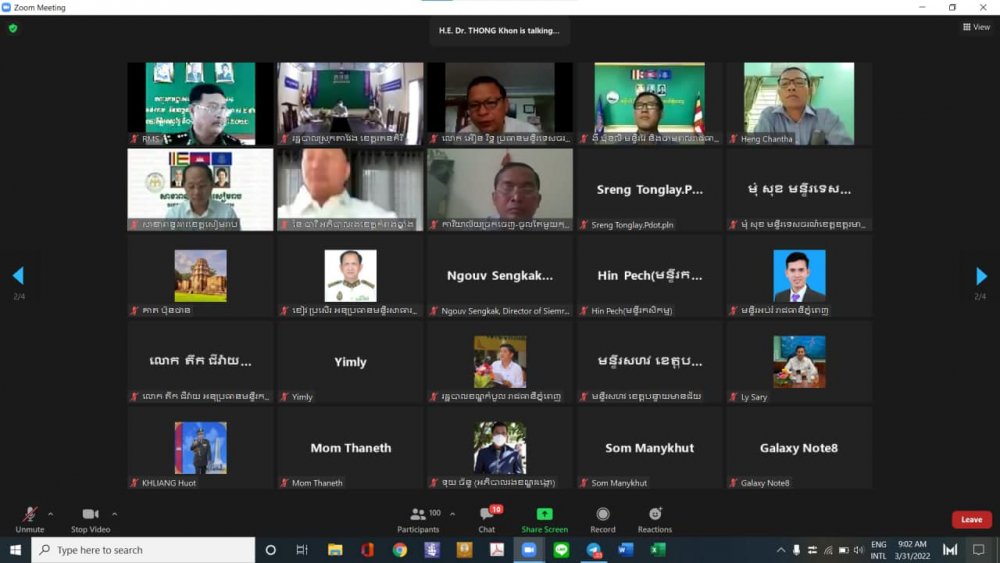 នាព្រឹកថ្ងៃព្រហស្បតិ៍ ១៤រោច ខែផល្គុន ឆ្នាំឆ្លូវ ត្រីស័ក ព.ស. ២៥៦៥ ត្រូវនឹងថ្ងៃទី៣១ ខែមីនា ឆ្នាំ២០២២ នាវេលាម៉ោង ០៩៖០០នាទីព្រឹក បណ្ឌិត តាន់ មុនីវណ្ណ អនុប្រធានសភាពាណិជ្ជកម្មកម្ពុជា តំណាងដ៏ខ្ពង់ខ្ពស់ អ្នកឧកញ៉ា គិត ម៉េង ប្រធានសភាពាណិជ្ជកម្មកម្ពុជា បានអញ្ជើញចូលរួម «កិច្ចប្រជុំលើកទី១ របស់គណៈកម្មាធិការជាតិគ្រប់គ្រង និងអភិវឌ្ឍសហគមន៍ទេសចរណ៍ និងអេកូទេសចរណ៍ (គ.ជ.អ.អ)» តាមប្រព័ន្ធ ហ្សូម (Zoom) ក្រោមអធិបតីភាព ឯកឧត្តម ថោង ខុន រដ្ឋមន្ត្រីក្រសួងទេសចរណ៍ និងជាប្រធាន គ.ជ.អ.អ ព្រមទាំងវត្តមាន ឯកឧត្តម វេង សាខុន រដ្ឋមន្ត្រីក្រសួងកសិកម្ម រុក្ខាប្រមាញ់ និងនេសាទ និងជាអនុប្រធាន គ.ជ.អ.អ, ឯកឧត្តម សាយ សំអាល់ រដ្ឋមន្ត្រីក្រសួងបរិស្ថាន និងជាអនុប្រធានអចិន្ត្រៃយ៍ គ.ជ.អ.អ និង សមាជិក សមាជិក នៃ គ.ជ.អ.អ។