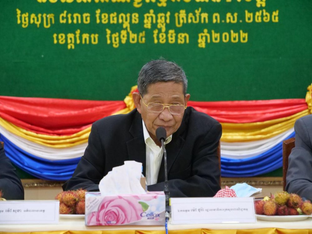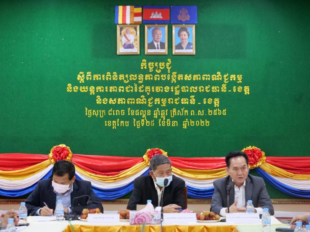 កិច្ចប្រជុំស្ដីពីការពិនិត្យលទ្ធភាពបង្កើតសភាពាណិជ្ជកម្មខេត្តកែប និងផ្សព្វផ្សាយអំពីយន្តការភាពជាដៃគូរវាងរដ្ឋបាលរាជធានី-ខេត្ត និងសភាពាណិជ្ជកម្មខេត្ត-ក្រុង បានប្រារព្វធ្វើឡើងនៅសាលាខេត្តកែបកាលពីថ្ងៃទី២៥ ខែមិនា ឆ្នាំ២០២២ ក្រោមអធបតីភាពឯកឧត្តម ម៉ៅ ថូរ៉ា រដ្ឋលេខាធិការក្រសួងពាណិជ្ជកម្ម ឯកឧត្តម អ៊ុ ថា អភិបាលរងនៃគណៈអភិបាលខេត្ត តំណាងដ៏ខ្ពង់ខ្ពស់ឯកឧត្តមបណ្ឌិត សោម ពិសិដ្ឋ អភិបាលនៃគណៈអភិបាលខេត្តកែប ឯកឧត្តមឧកញ៉ា ងួន ម៉េងតិច អគ្គនាយកសភាពាណិជ្ជកម្មកម្ពុជា និងតំណាងមន្ទីពាកព័ន្ធនានាក្នុងខេត្ត លោកប្រធានមន្ទីពាណិជ្ជកម្ម និងពាណិជ្ជករ អាជីវករក្នុងខេត្តប្រមាណ៣០រូប ។ យោងលើរបាយការណ៍របស់លោកប្រធានមន្ទីពាណិជ្ជកម្មខេត្តបានបញ្ជាក់ថាបច្ចុប្បន្នខេត្តមានក្រុមហ៊ុន សហគ្រាសដែលបានចុះបញ្ជីចំនួន៨៨ និងមូលដ្ឋានសេវាកម្ម អាជីវកម្ម ពាណិជ្ជកម្មចំនួន៤៥០ ។ ខេត្តកែបក្រៅពីសក្ដានុពលទេសចរណ៍ មានទំនិញសក្ដានុពលផ្សេងទៀតដូចជា៖ ស្វាយកែវរមៀត ផលិតផលសមុទ្រ ម្រេចកំពតជាដើម។ល។ បើតាមទិនន័យខាងលើអាចធ្វើការវាយតម្លៃបានថាខេត្តកែបមានលក្ខណៈសម្បត្តិអាចបង្កើតសភាពាណិជ្ជកម្មខេត្តបាន ។ ក្រៅពីនេះឯកឧត្តម ឧកញ៉ា ងួន ម៉េងតិច បានលើកឡើងពីយន្តការភាពជាដៃគូរវាងរដ្ឋបាលរាជធានី-ខេត្ត និងសភាពាណិជ្ជកម្មខេត្ត-ក្រុង ដែលយន្តការនេះមានសារៈសំខាន់ណាស់ដើម្បីជួយសម្រួលរាល់សំណូមពររបស់ពាណិជ្ជករដែលជួបបញ្ហាប្រឈមក្នុងការធ្វើពាណិជ្ជកម្មក្នុងខេត្ត ។
