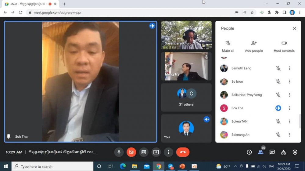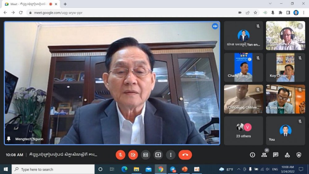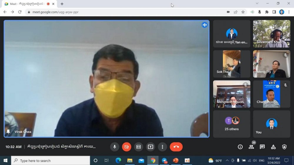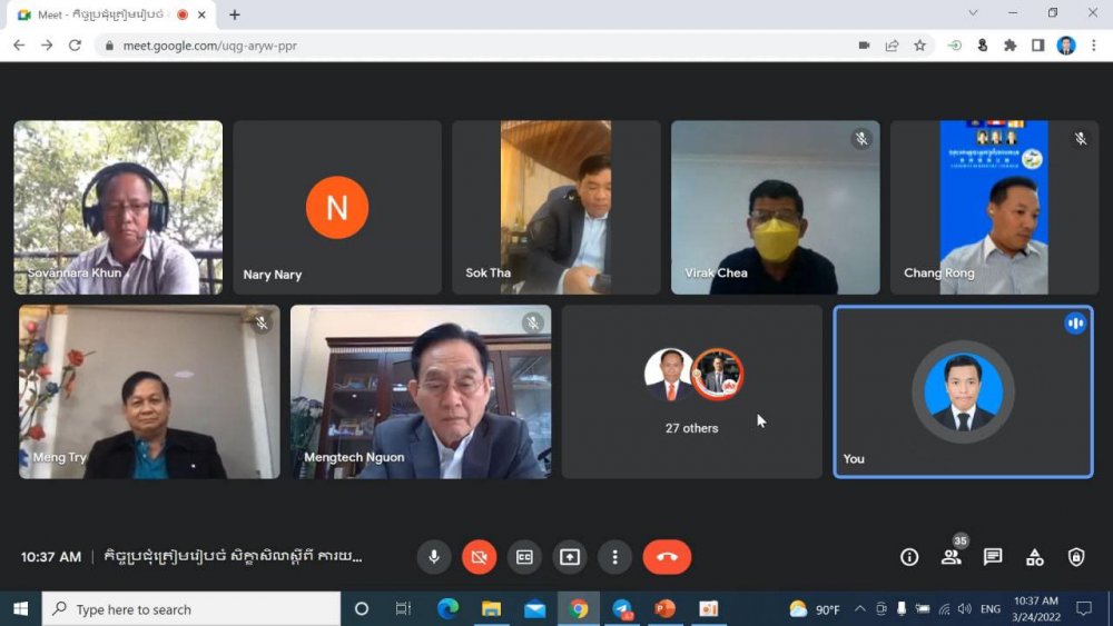 នៅព្រឹកថ្ងៃព្រហស្បតិ៍ ៧រោច ខែផល្គុន ឆ្នាំឆ្លូវ ត្រីស័ក ព.ស ២៥៦៥ ត្រូវនឹងថ្ងៃទី២៤ ខែមិនា ឆ្នាំ២០២២ នៅអគ្គនាយកដ្ឋានសភាពាណិជ្ជកម្មកម្ពុជាមានកិច្ចប្រជុំត្រៀមរៀបចំសិក្ខាសាលាស្ដី«ការយល់ដឹងពីការធ្វើអាជីវកម្មរបស់ពាណិជ្ជករកម្ពុជាដើម្បីកាត់បន្ថយបញ្ហាប្រឈមផ្នែកផ្លូវច្បាប់»ក្រោមអធិបតីភាពឯកឧត្តមឧកញ៉ា ងួន ម៉េងតិច អគ្គនាយកសភាពាណិជ្ជកម្មកម្ពុជាដោយមានការអញ្ជើញចូលរួមពីលោកឧកញ៉ា លោក ប្រធាន អនុប្រធាន សមាជិក សមាជិកា និងបុគ្គលិកសភាពាណិជ្ជខេត្តចំនួន៣៦រូបដែលអញ្ជើញមកពី១៧សភាពាណិជ្ជកម្មខេត្ត ។ កិច្ចប្រជុំនេះពិភាក្សាលើនិតិវិធី និងការទទួលខុសត្រូវក្នុងការរៀនចំកម្មវិធីអោយទទួលបានជោគជ័យក្នុងគោលបំណងផ្សព្វផ្សាយច្បាប់បញ្ញត្តិថ្មីៗជូនដល់សមាជិក សមាជិកា ពាណិជ្ជករ អាជីវករ បានយល់ដឹងកាន់តែទូលំទូលាយដើម្បីកាត់បន្ថយបញ្ហាប្រឈមផ្សេងៗក្នុងអាជីវកម្ម ។ កិច្ចប្រជុំបានឯកភាពក្នុងការរៀបចំសិក្ខាសាលនេះ និងបញ្ចប់ប្រកបដោយបរិយាកាសរីករាយ ។