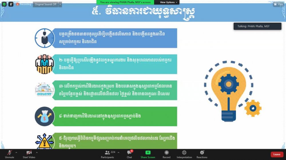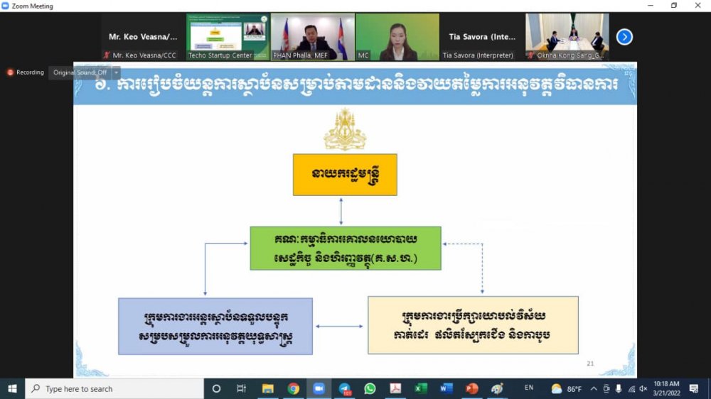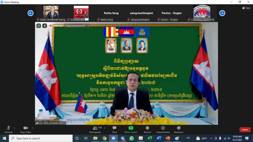 នាព្រឹកថ្ងៃចន្ទ ទី២១ ខែមិនា ឆ្នាំ២០២២ វេលាម៉ោង ១០:៣០នាទីព្រឹក នាក្រសួងសេដ្ឋកិច្ចនិងហិរញ្ញវត្ថុ បានរៀបចំពិធីផ្សព្វផ្សាយដាក់ឲ្យអនុវត្តផ្លូវការ នូវ “យុទ្ធសាស្ត្រអភិវឌ្ឍន៍វិស័យកាត់ដេរ ផលិតផលស្បែកជើង និង កាបូបកម្ពុជា ២០២២-២០២៧” តាមរយៈប្រព័ន្ធអនឡាញហ្ស៊ូម។