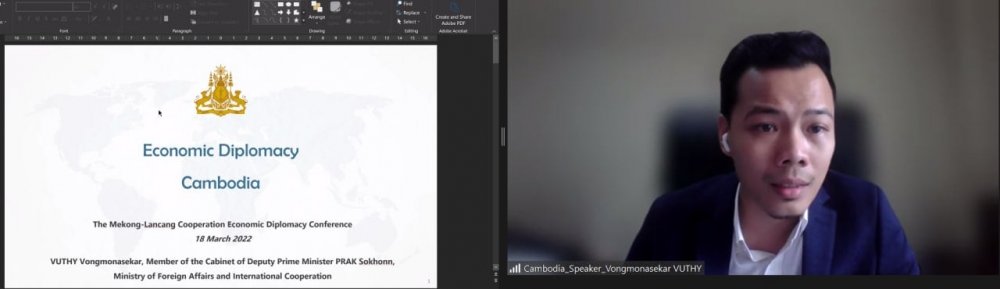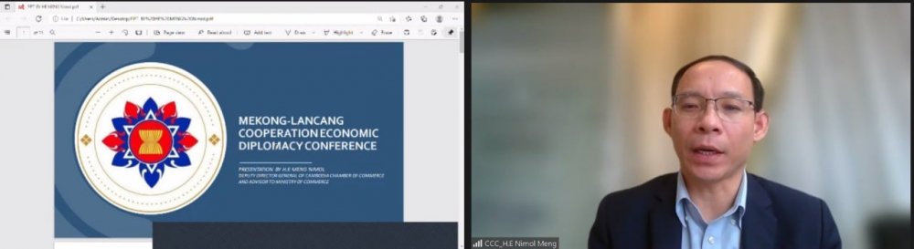 នារសៀលថ្ងៃសុក្រ ១ រោច ខែផល្គុន ឆ្នាំឆ្លូវ ត្រីស័ក ព.ស ២៥៦៥ ត្រូវនឹងថ្ងៃទី ១៨ ខែមីនា ឆ្នាំ ២០២២ ឯកឧត្តម ម៉េង និមល អគ្គនាយករងសភាពាណិជ្ជកម្ម តំណាងឯកឧត្តមឧកញ៉ា ងួន ម៉េងតិច អគ្គនាយកសភាពាណិជ្ជកម្មកម្ពុជា បានអញ្ជើញចូលរួមធ្វើជាវាគ្មិន ពិភាក្សាអំពីប្រធានបទ “សេដ្ឋកិច្ចការទូត៖ ទស្សនវិស័យរបស់វិស័យឯកជន” ក្នុងឱកាសនៃសន្និសីទកិច្ចសហប្រតិបត្តិការមេគង្គ - ឡាងឆាង សេដ្ឋកិច្ចការទូត ដែលប្រព្រឹត្តទៅតាមប្រព័ន្ធអនឡាញ ក្រោមអធីបតីភាព ឯកឧត្តម Thongphane Savanphet អនុរដ្ឋមន្ត្រីក្រសួងការបរទេស ឡាវ និងមានការអញ្ជើញចូលរួមពីមន្ត្រីជាន់ខ្ពស់ សមាជិកក្រុមការងារសេដ្ឋកិច្ចការទូត និងតំណាងពីសភាពាណិជ្ជកម្ម ពីប្រទេសមេគង្គ - ឡាងឆាង។