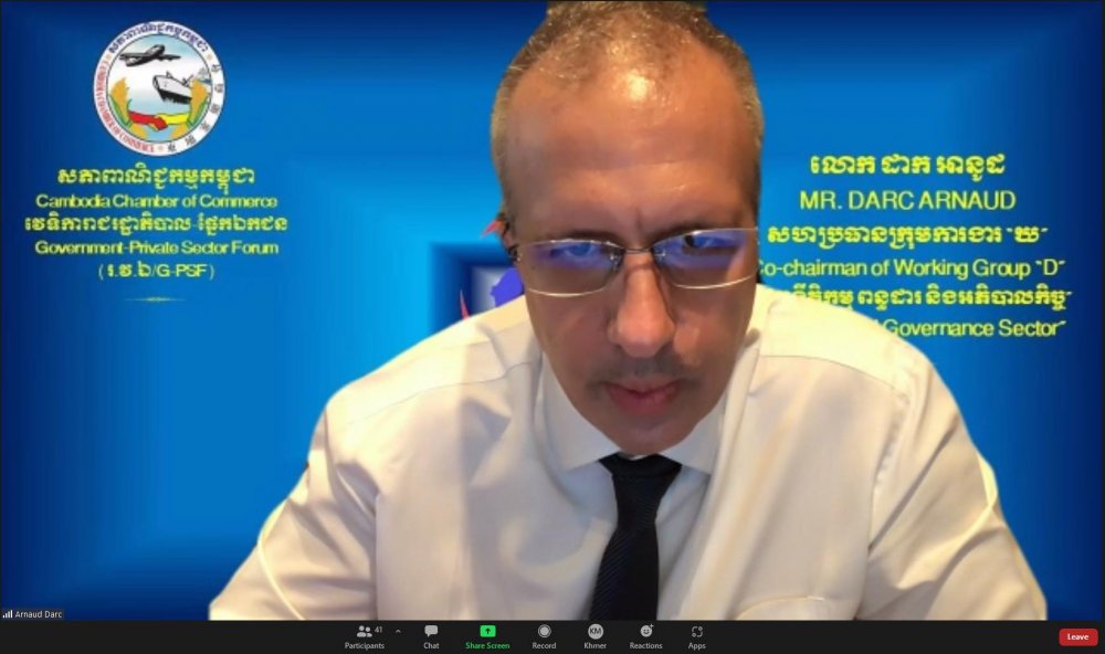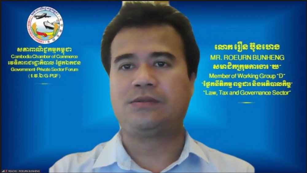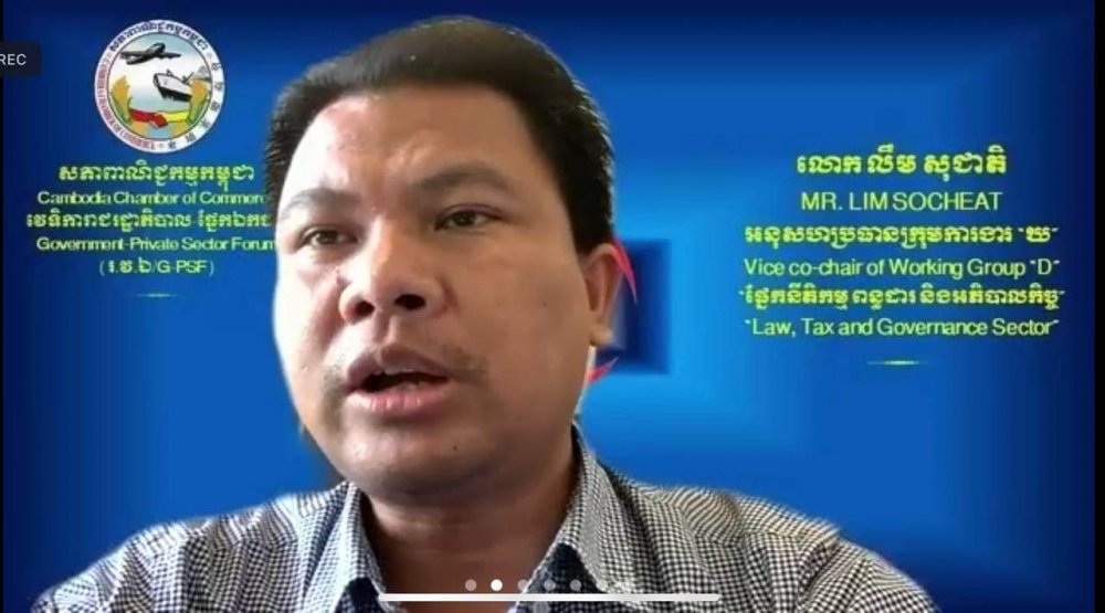 ថ្ងៃព្រហស្បតិ៍ ១៥កើត ខែផល្គុន ឆ្នាំឆ្លូវ ត្រីស័ក ព.ស ២៥៦៥ ត្រូវនឹងថ្ងៃទី១៧ ខែមីនា ឆ្នាំ២០២២ វេលាម៉ោង ១០:០០នាទីព្រឹក មានរៀបចំកិច្ចប្រជុំក្រុមការងារ ឃ “នីតិកម្ម ពន្ធដារ និងអភិបាលកិច្ច” ផ្នែកឯកជន នៃវេទិការាជរដ្ឋាភិបាល-ផ្នែកឯកជន តាមរយៈប្រព័ន្ធអនឡាញ ក្រោមអធិបតីភាព លោក អានូដ ដាក សហប្រធានក្រុមការងារ ឃ “នីតិកម្ម ពន្ធដារ និងអភិបាលកិច្ច” ផ្នែកឯកជន។ កិច្ចប្រជុំនេះក៏មានការចូលរួមផងដែរពីសំណាក់ ឯកឧត្តម ឧកញ៉ា ងួន ម៉េង តិច អគ្គនាយកសភាពាណិជ្ជកម្មកម្ពុជា ព្រមទាំងសមាជិក សមាជិកា សភាពាណិជ្ជកម្មកម្ពុជា អនុសហប្រធានក្រុមការងារ ឃ ផ្នែកឯកជន តំណាងសភាពាណិជ្ជកម្មអន្តរជាតិនៃកម្ពុជា តំណាងក្រុមហ៊ុនឯកជន និងសមាជិក សមាជិកាក្រុមការងារជាច្រើនទៀតផងដែរ។