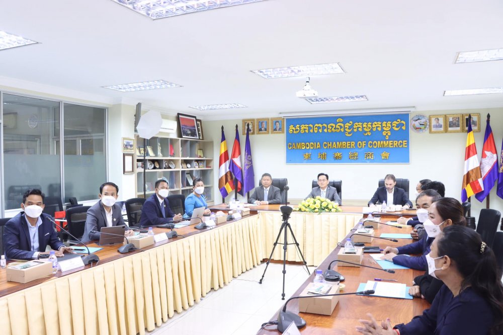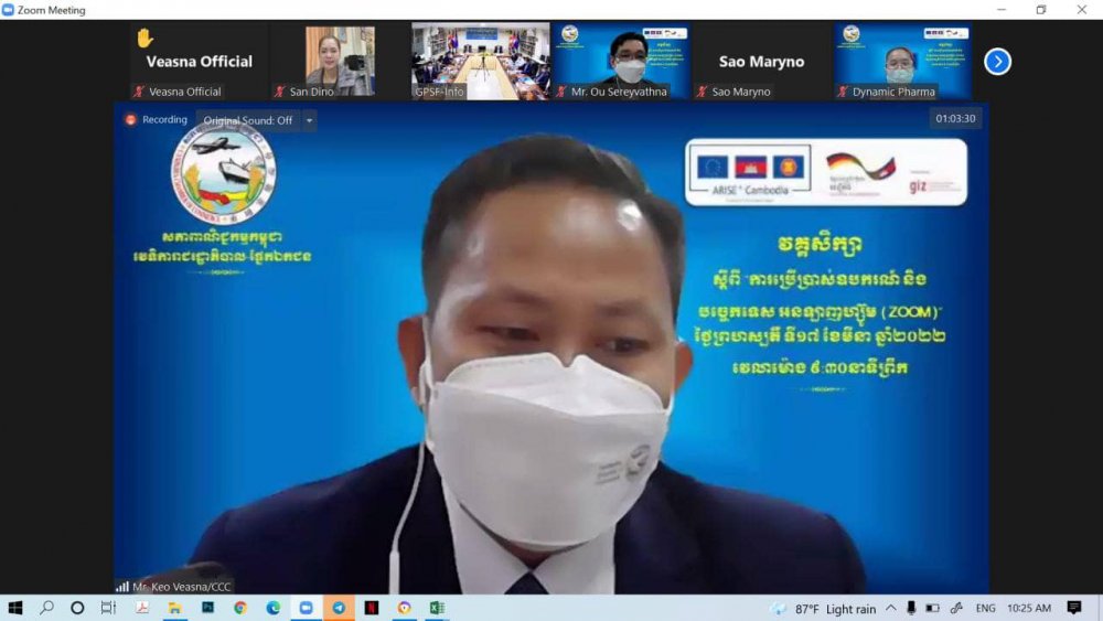 ថ្ងៃព្រហស្បតិ៍ ១៥កើត ខែផល្គុន ឆ្នាំឆ្លូវ ត្រីស័ក ព.ស ២៥៦៥ ត្រូវនឹងថ្ងៃទី១៧ ខែមីនា ឆ្នាំ២០២២ វេលាម៉ោង ០៩:៣០នាទីព្រឹក នាអគ្គនាយកសភាពាណិជ្ជកម្មកម្ពុជា មានរៀបចំវគ្គសិក្សាយល់ដឹងអំពី “ការប្រើប្រាស់ឧបករណ៍ និងបច្ចេកទេស អនឡាញហ្ស៊ូម ZOOM” តាមរយៈការចូលរួមដោយផ្ទាល់ និងចូលរួមពីចម្ងាយតាមរយៈអនឡាញ “Hybrid” ។ ឯកឧត្តម ឧកញ៉ា ងួន ម៉េងតិច អគ្គនាយកសភាពាណិជ្ជកម្មកម្ពុជា ចូលរួមជាអធិបតី និងថ្លែងសន្ទរកថាក្នុងពិធីបើកវគ្គសិក្សា ស្តីពី «ការប្រើប្រាស់ឧបករណ៍ និងបច្ចេកទេស អនឡាញហ្ស៊ូម (Zoom)» និងវត្តមាន Mr. Guillaume Maltarverne អ្នកផ្តល់យោបល់ផ្នែកច្បាប់ និងព័ត៌មានពាណិជ្ជកម្ម តំណាងកម្មវិធី ARISE+ ប្រចាំកម្ពុជា និងលោក ដង ហេង ទីប្រឹក្សាជាន់ខ្ពស់ផ្នែកសហគ្រាសធុនតូច និងមធ្យមនៃកម្មវិធី ARISE+ ប្រចាំកម្ពុជា។ វគ្គសិក្សាយល់ដឹងនេះក៏មានការចូលរួមផងដែរពីសំណាក់ សមាជិក សមាជិកា សភាពាណិជ្ជកម្មកម្ពុជា តំណាងសហព័ន្ធស្រូវ-អង្ករ តំណាងក្រុមហ៊ុនដឹកជញ្ជូនឯកជន និងអ្នកចូលរួមដោយផ្ទាល់ និងតាមរយៈអនឡាញជាច្រើនទៀតផងដែរ។