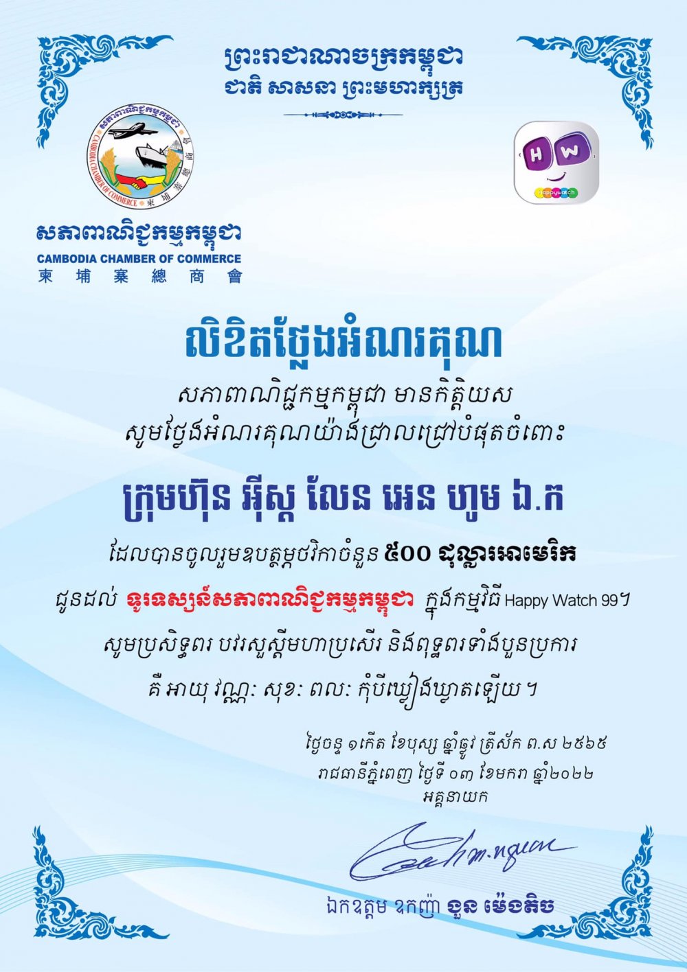 Cambodia Chamber of Commerce (CCC) has an honor to express its sincere thanks to EAST LAND AND HOME CO., LTD. for the contribution to the CCC’s Television on Happy Watch 99 Application.