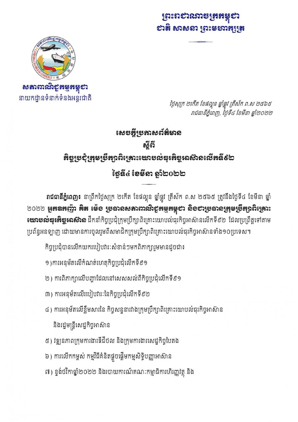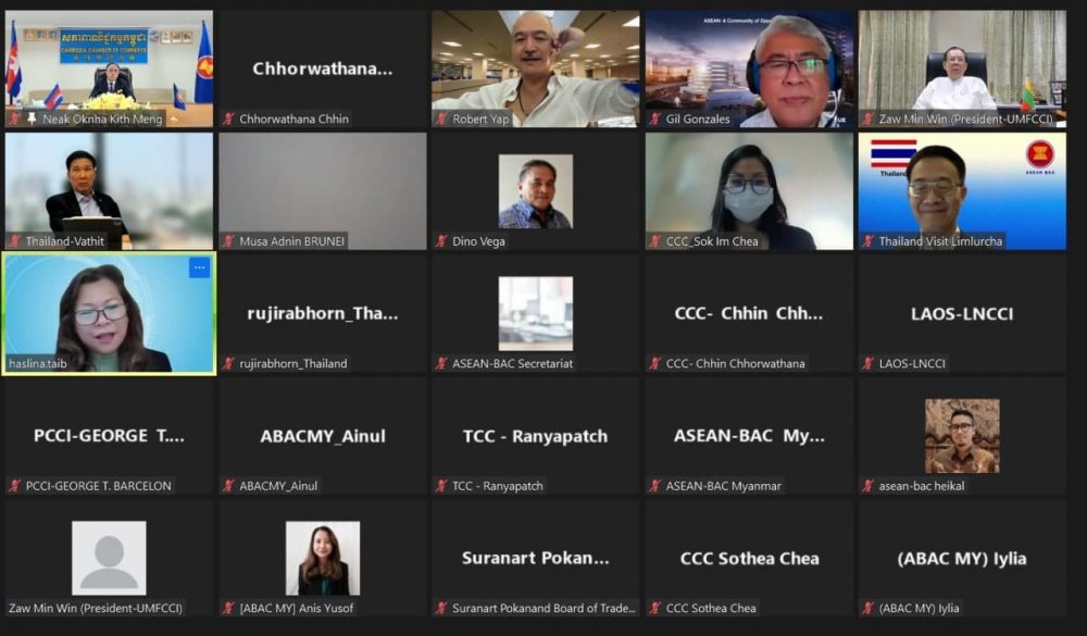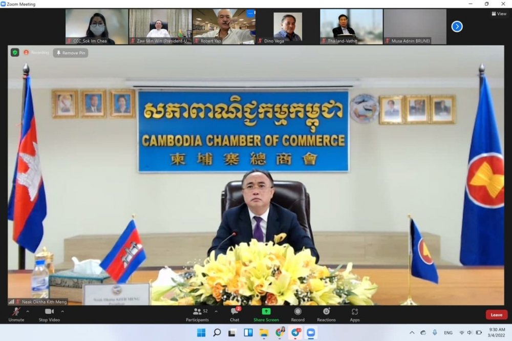 រាជធានីភ្នំពេញ៖ នាព្រឹកថ្ងៃសុក្រ ២កើត ខែផល្គុន ឆ្នាំឆ្លូវ ត្រីស័ក ព.ស ២៥៦៥ ត្រូវនឹងថ្ងៃទី៤ ខែមីនា ឆ្នាំ២០២២ អ្នកឧកញ៉ា គិត ម៉េង ប្រធានសភាពាណិជ្ជកម្មកម្ពុជា និងជាប្រធានក្រុមប្រឹក្សាពិគ្រោះយោបល់ធុរកិច្ចអាស៊ាន ដឹកនាំកិច្ចប្រជុំក្រុមប្រឹក្សាពិគ្រោះយោបល់ធុរកិច្ចអាស៊ានលើកទី៩២ ដែលប្រព្រឹត្តទៅតាមប្រព័ន្ធអនឡាញ ដោយមានការចូលរួមពីសមាជិកក្រុមប្រឹក្សាពិគ្រោះយោបល់ធុរកិច្ចអាស៊ានទាំង១០ប្រទេស។