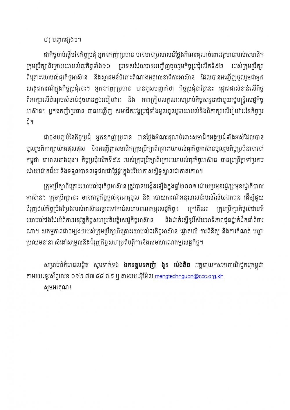 ជាចុងបញ្ចប់នៃកិច្ចប្រជុំ អ្នកឧកញ៉ាប្រធាន បានថ្លែងអំណរគុណចំពោះសមាជិកអង្គប្រជុំទាំងអស់ដែលបានចូលរួមពិភាក្សាយ៉ាងផុសផុស និងអញ្ជើញសមាជិកក្រុមប្រឹក្សាពិគ្រោះយោបល់ធុរកិច្ចអាស៊ានចូលរួមកិច្ចប្រជុំនានានៅកម្ពុជា នាពេលខាងមុខ។ កិច្ចប្រជុំលើកទី៩២ របស់ក្រុមប្រឹក្សាពិគ្រោះយោបល់ធុរកិច្ចអាស៊ាន បានប្រព្រឹត្តទៅប្រកបដោយជោគជ័យ និងទទួលបានលទ្ធផលជាផ្លែផ្កាក្នុងបរិយាកាសស្និទ្ធស្នាលជាភាតរភាព។