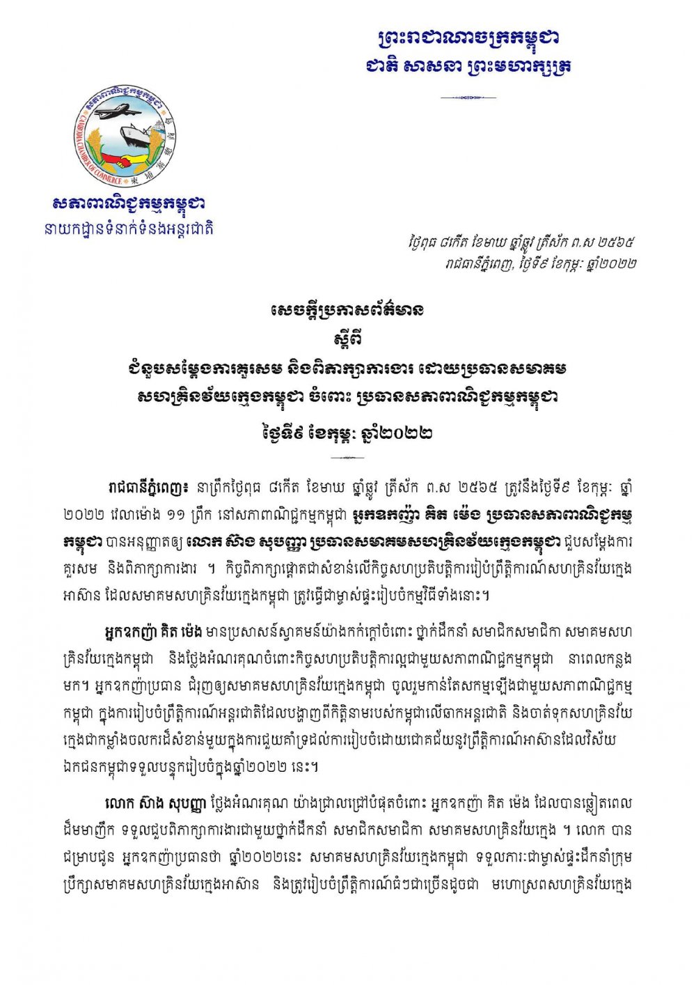នាព្រឹកថ្ងៃពុធ ៨កើត ខែមាឃ ឆ្នាំឆ្លូវ ត្រីស័ក ព.ស ២៥៦៥ ត្រូវនឹងថ្ងៃទី៩ ខែកុម្ភៈ ឆ្នាំ២០២២ វេលាម៉ោង ១១ ព្រឹក នៅសភាពាណិជ្ជកម្មកម្ពុជា អ្នកឧកញ៉ា គិត ម៉េង ប្រធានសភាពាណិជ្ជកម្មកម្ពុជា បានអនុញ្ញាតឲ្យ លោក ស៊ាង សុបញ្ញា ប្រធានសមាគមសហគ្រិនវ័យក្មេងកម្ពុជា ជួបសម្តែងការគួរសម និងពិភាក្សាការងារ ។ កិច្ចពិភាក្សាផ្តោតជាសំខាន់លើកិច្ចសហប្រតិបត្តិការរៀបំព្រឹត្តិការណ៍សហគ្រិនវ័យក្មេង