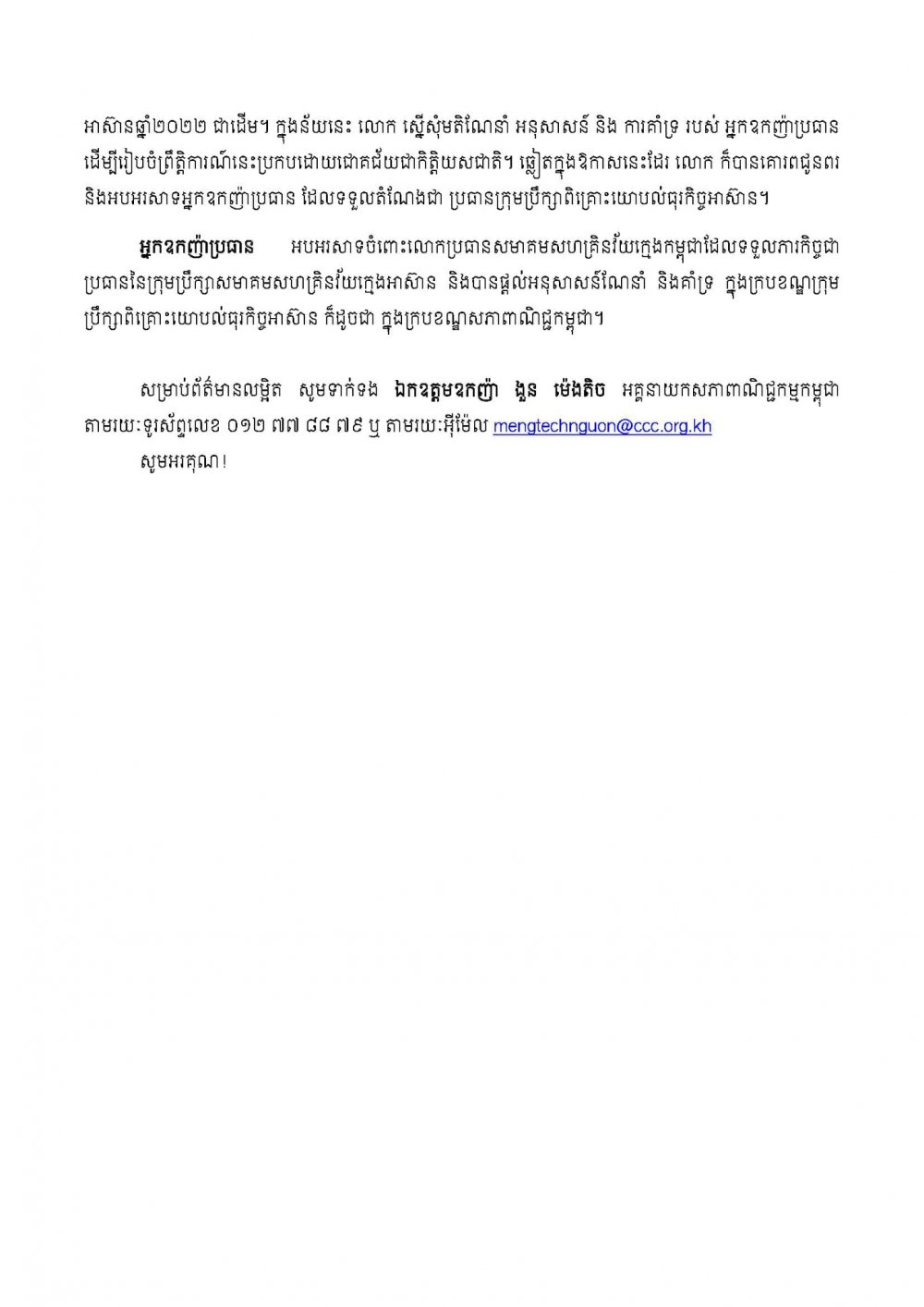 អាស៊ានឆ្នាំ២០២២ ជាដើម។ ក្នុងន័យនេះ លោក ស្នើសុំមតិណែនាំ អនុសាសន៍ និង ការគាំទ្រ របស់ អ្នកឧកញ៉ាប្រធាន ដើម្បីរៀបចំព្រឹត្តិការណ៍នេះប្រកបដោយជោគជ័យជាកិត្តិយសជាតិ។ ឆ្លៀតក្នុងឱកាសនេះដែរ លោក ក៏បានគោរពជូនពរ និងអបអរសាទអ្នកឧកញ៉ាប្រធាន ដែលទទួលតំណែងជា ប្រធានក្រុមប្រឹក្សាពិគ្រោះយោបល់ធុរកិច្ចអាស៊ាន។