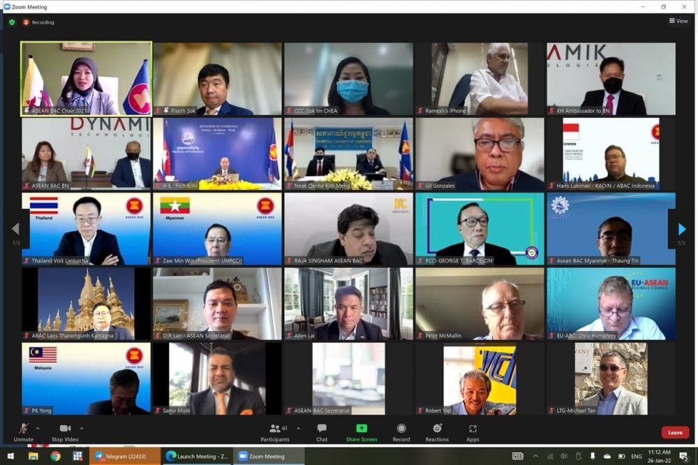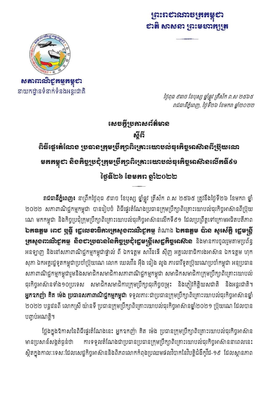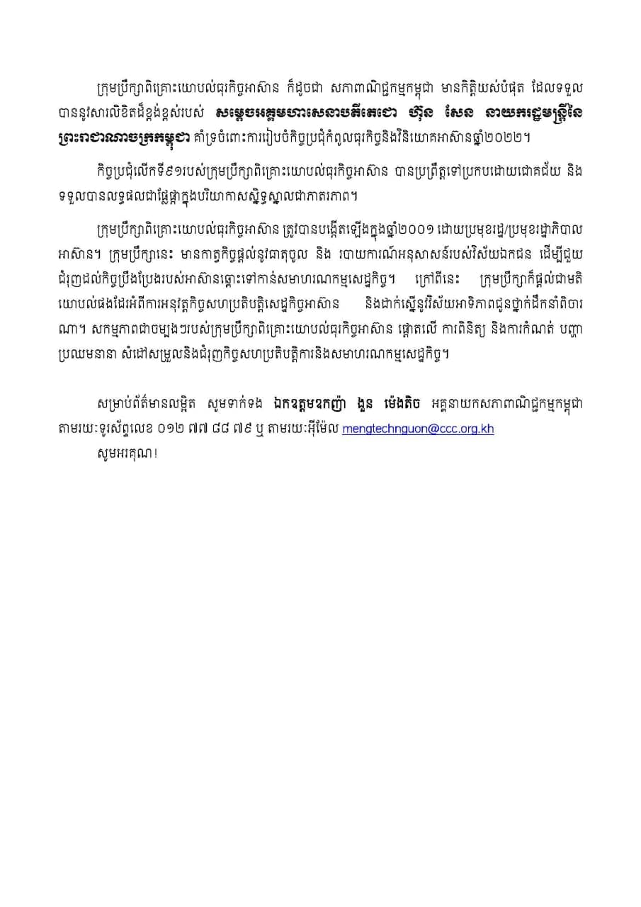 រាជធានីភ្នំពេញ៖ នាព្រឹកថ្ងៃពុធ ៩រោច ខែបុស្ស ឆ្នាំឆ្លូវ ត្រីស័ក ព.ស ២៥៦៥ ត្រូវនឹងថ្ងៃទី២៦ ខែមករា ឆ្នាំ២០២២ សភាពាណិជ្ជកម្មកម្ពុជា បានរៀបចំ ពិធីផ្ទេរតំណែងប្រធានក្រុមប្រឹក្សាពិគ្រោះយោបល់ធុរកិច្ចអាស៊ានពីប្រ៊ុយណេ មកកម្ពុជា និងកិច្ចប្រជុំក្រុមប្រឹក្សាពិគ្រោះយោបល់ធុរកិច្ចអាស៊ានលើកទី៩១ ដែលប្រព្រឹត្តទៅក្រោមអធិតបតីភាព ឯកឧត្តម ពេជ ឬទ្ធី រដ្ឋលេខាធិការក្រសួងពាណិជ្ជកម្ម តំណាង ឯកឧត្តម ប៉ាន សូរស័ក្តិ រដ្ឋមន្ត្រីក្រសួងពាណិជ្ជកម្ម និងជាប្រធាននៃកិច្ចប្រជុំរដ្ឋមន្ត្រីសេដ្ឋកិច្ចអាស៊ាន និងមានការចូលរួមតាមប្រព័ន្ធអនឡាញ និងនៅសភាពាណិជ្ជកម្មកម្ពុជាផ្ទាល់ ពី ឯកឧត្តម សាវីនឌើ ស៊ីញ អគ្គលេខាធិការងអាស៊ាន ឯកឧត្តម ហុក សុភា ឯកអគ្គរដ្ឋទូតកម្ពុជាប្រចាំប្រ៊ុយណេ លោក ឃេលវីន អ៊ឹង ធៀង លូង ភារធារីទូតប្រ៊ុយណេប្រចាំកម្ពុជា អនុប្រធានសភាពាណិជ្ជកម្មកម្ពុជារួមនិងសមាជិកសមាជិកាសភាពាណិជ្ជកម្មកម្ពុជា សមាជិកសមាជិកាក្រុមប្រឹក្សាពិគ្រោះយោបល់ធុរកិច្ចអាស៊ានទាំង១០ប្រទេស សមាជិកសមាជិការក្រុមប្រឹក្សាធុរកិច្ចចម្រុះ និងភ្ញៀវកិត្តិយសជាតិ និងអន្តរជាតិ។