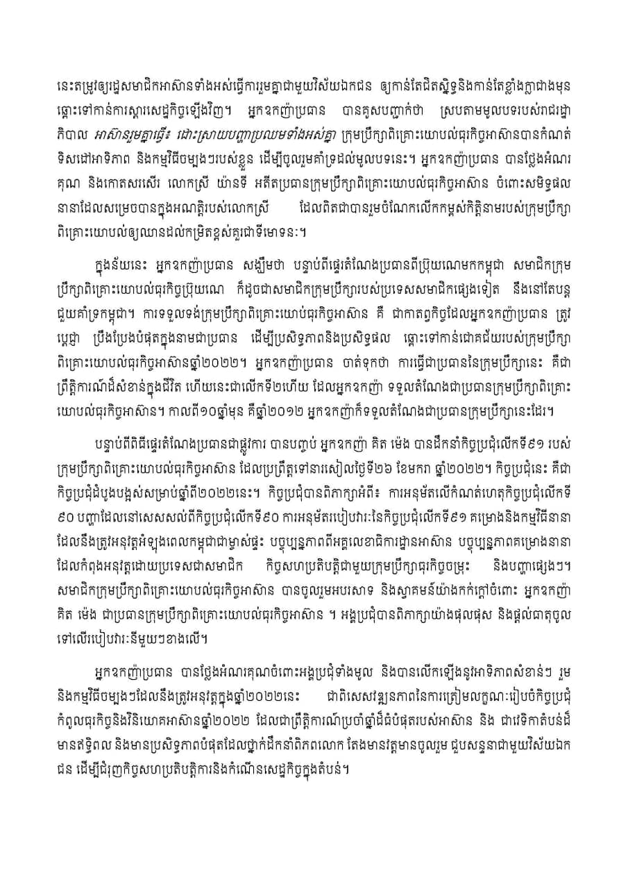 អ្នកឧកញ៉ា គិត ម៉េង ប្រធានសភាពាណិជ្ជកម្មកម្ពុជា ទទួលភារៈជាប្រធានក្រុមប្រឹក្សាពិគ្រោះយោបល់ធុរកិច្ចអាស៊ានឆ្នាំ២០២២ បន្តវេនពី លោកស្រី យ៉ានទី ប្រធានក្រុមប្រឹក្សាពិគ្រោះយោបល់ធុរកិច្ចអាស៊ានឆ្នាំ២០២១ ប្រ៊ុយណេ ដែលបានបញ្ចប់អណត្តិ។