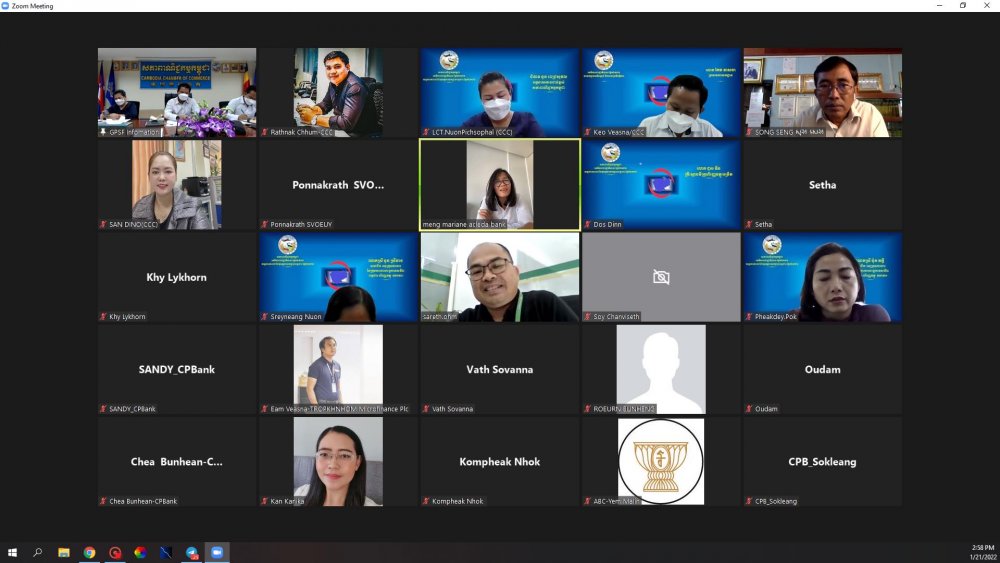 ថ្ងៃសុក្រ ០៤រោច ខែបុស្ស ឆ្នាំឆ្លូវ ត្រីស័ក ព.ស ២៥៦៥ ត្រូវនឹងថ្ងៃទី២១ ខែមករា ឆ្នាំ២០២២ វេលាម៉ោង ០២:៣០នាទីរសៀល នាសភាពាណិជ្ជកម្មកម្ពុជា មានរៀបចំកិច្ចប្រជុំអនុក្រុមការងារបច្ចេកទេស នៃក្រុមការងារបច្ចេកទេសទី២ “ពន្ធដារ-ហិរញ្ញវត្ថុ ធនាគារ” នៃយន្តការភាពជាដៃគូអគ្គនាយកដ្ឋានពន្ធដារ-ផ្នែកឯកជន តាមប្រព័ន្ធអនឡាញហ្ស៊ូម (ZOOM) ក្រោមអធិបតីភាព លោក លឹម សុជាតិ សហប្រធានអនុក្រុមការងារបច្ចេកទេស នៃក្រុមការងារបច្ចេកទេសទី២ “ពន្ធដារ-ហិរញ្ញវត្ថុ ធនាគារ” នៃយន្តការភាពជាដៃគូអគ្គនាយកដ្ឋានពន្ធដារ-ផ្នែកឯកជន។ កិច្ចប្រជុនេះក៏មានការចូលរួមផងដែរពីសំណាក់ សមាជិក សមាជិកាសភាពាណិជ្ជកម្មកម្ពុជា តំណាងសមាគមធនាគារកម្ពុជា តំណាងគ្រឹះស្ថានមីក្រូហិរញ្ញវត្ថុកម្ពុជា និងសមាជិក សមាជិការនៃអនុក្រុមការងារបច្ចេកទេសជាច្រើនទៀតផង។