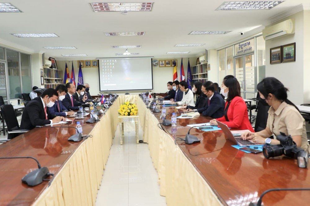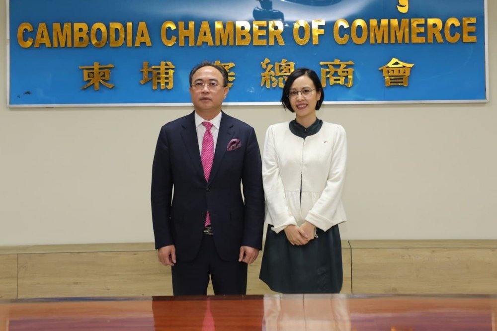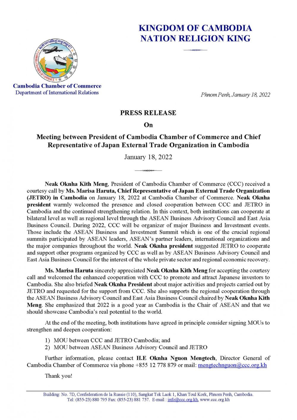 Neak Oknha Kith Meng, President of Cambodia Chamber of Commerce (CCC) received a courtesy call by Ms. Marisa Haruta, Chief Representative of Japan External Trade Organization (JETRO) in Cambodia on January 18, 2022 at Cambodia Chamber of Commerce. Neak Oknha president warmly welcomed the presence and closed cooperation between CCC and JETRO in Cambodia and the continued strengthening relation. In this context, both institutions can cooperate at bilateral level as well as regional level through the ASEAN Business Advisory Council and East Asia Business Council.