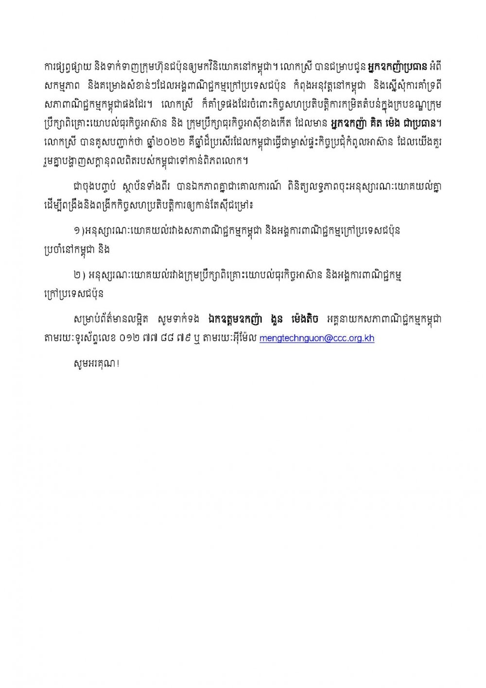 Ms. Marisa Haruta sincerely appreciated Neak Oknha Kith Meng for accepting the courtesy call and welcomed the enhanced cooperation with CCC to promote and attract Japanese investors to Cambodia. She also briefed Neak Oknha President about major activities and projects carried out by JETRO and requested for the support from CCC. She also supports the regional cooperation through the ASEAN Business Advisory Council and East Asia Business Council chaired by Neak Oknha Kith Meng.