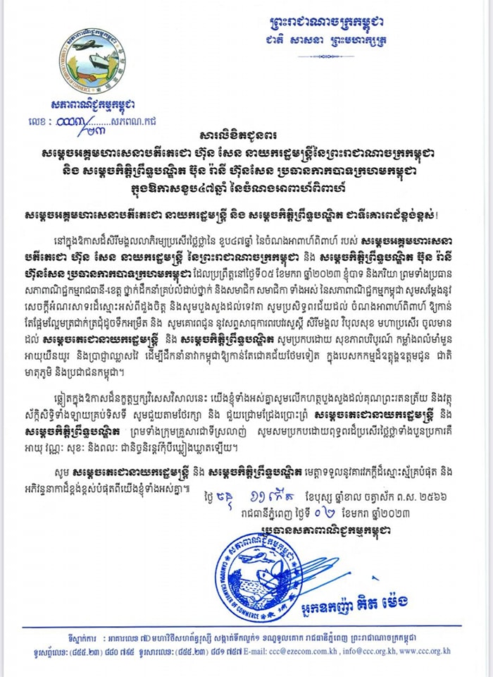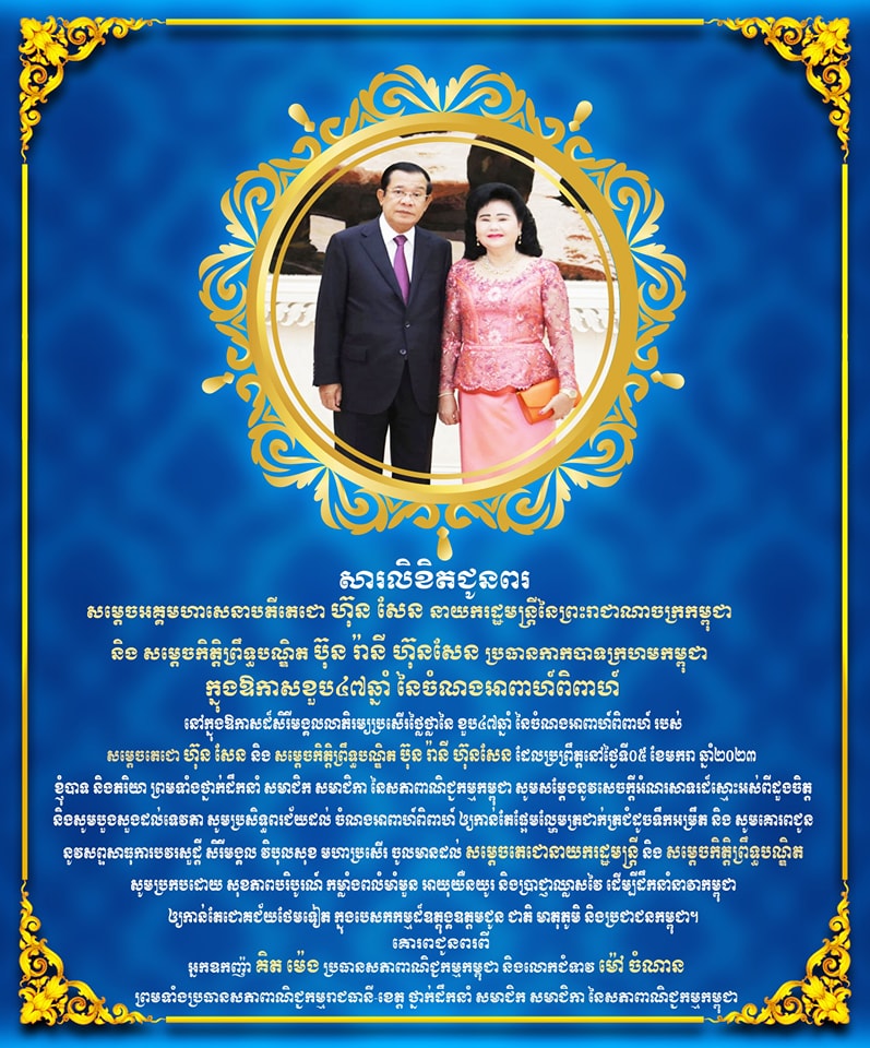 សារលិខិតជូនពរ របស់ អ្នកឧកញ៉ា គិត ម៉េង ប្រធានសភាពាណិជ្ជកម្មកម្ពុជា និងលោកជំទាវ ម៉ៅ ចំណាន ព្រមទាំងប្រធានសភាពាណិជ្ជកម្មរាជធានី-ខេត្ត ថ្នាក់ដឹកនាំគ្រប់លំដាប់ថ្នាក់ និង សមាជិក-សមាជិកា ទាំងអស់ នៃសភាពាណិជ្ជកម្មកម្ពុជា គោរពជូន សម្តេចអគ្គមហាសេនាបតីតេជោ ហ៊ុន សែន នាយករដ្ឋមន្រ្តី នៃព្រះរាជាណាចក្រកម្ពុជា និង សម្ដេចកិត្តិព្រឹទ្ធបណ្ឌិត ប៊ុន រ៉ានី ហ៊ុនសែន ប្រធានកាកបាទក្រហមកម្ពុជា នៅក្នុងឱកាសដ៏សិរីមង្គលលាភិរម្យប្រសើរថ្លៃថ្លានៃ ខួប៤៧ឆ្នាំ នៃចំណងអាពាហ៍ពិពាហ៍ របស់ សម្តេចតេជោនាយករដ្ឋមន្ត្រី និង សម្ដេចកិត្តិព្រឹទ្ធបណ្ឌិត។