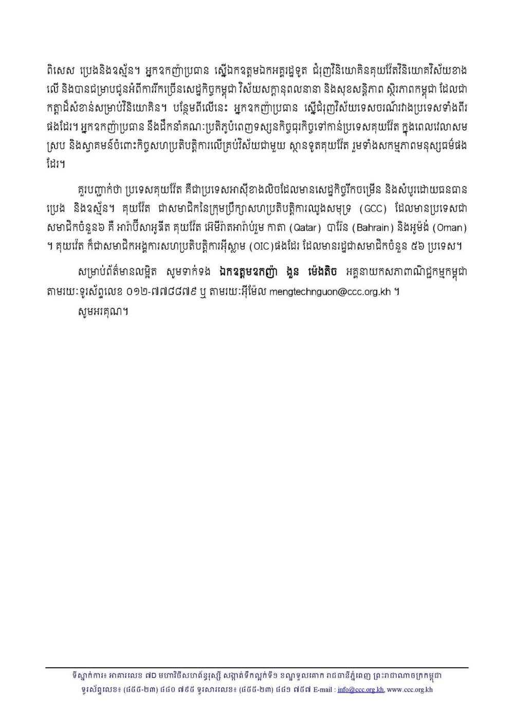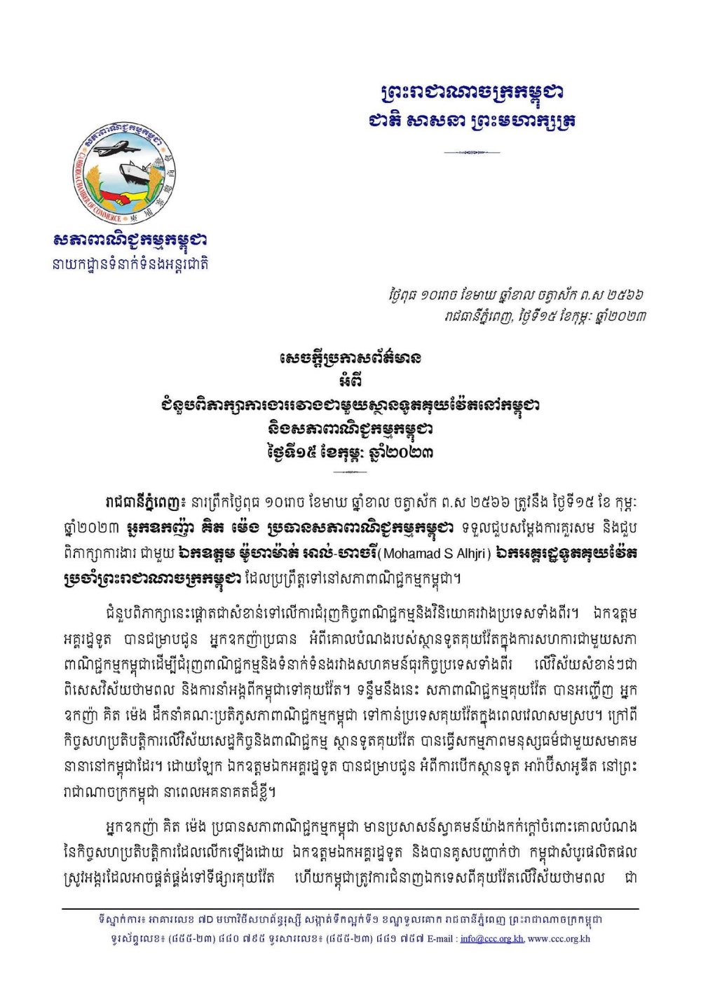 រាជធានីភ្នំពេញ៖ នារព្រឹកថ្ងៃពុធ ១០រោច ខែមាឃ ឆ្នាំខាល ចត្វាស័ក ព.ស ២៥៦៦ ត្រូវនឹង ថ្ងៃទី១៥ ខែ កុម្ភៈ ឆ្នាំ២០២៣ អ្នកឧកញ៉ា គិត ម៉េង ប្រធានសភាពាណិជ្ជកម្មកម្ពុជា ទទួលជួបសម្តែងការគួរសម និងជួបពិភាក្សាការងារ ជាមួយ ឯកឧត្តម ម៉ូហាម៉ាត់ អាល់-ហាចរី(Mohamad S Alhjri) ឯកអគ្គរដ្ឋទូតគុយវ៉ែតប្រចាំព្រះរាជាណាចក្រកម្ពុជា ដែលប្រព្រឹត្តទៅនៅសភាពាណិជ្ជកម្មកម្ពុជា។