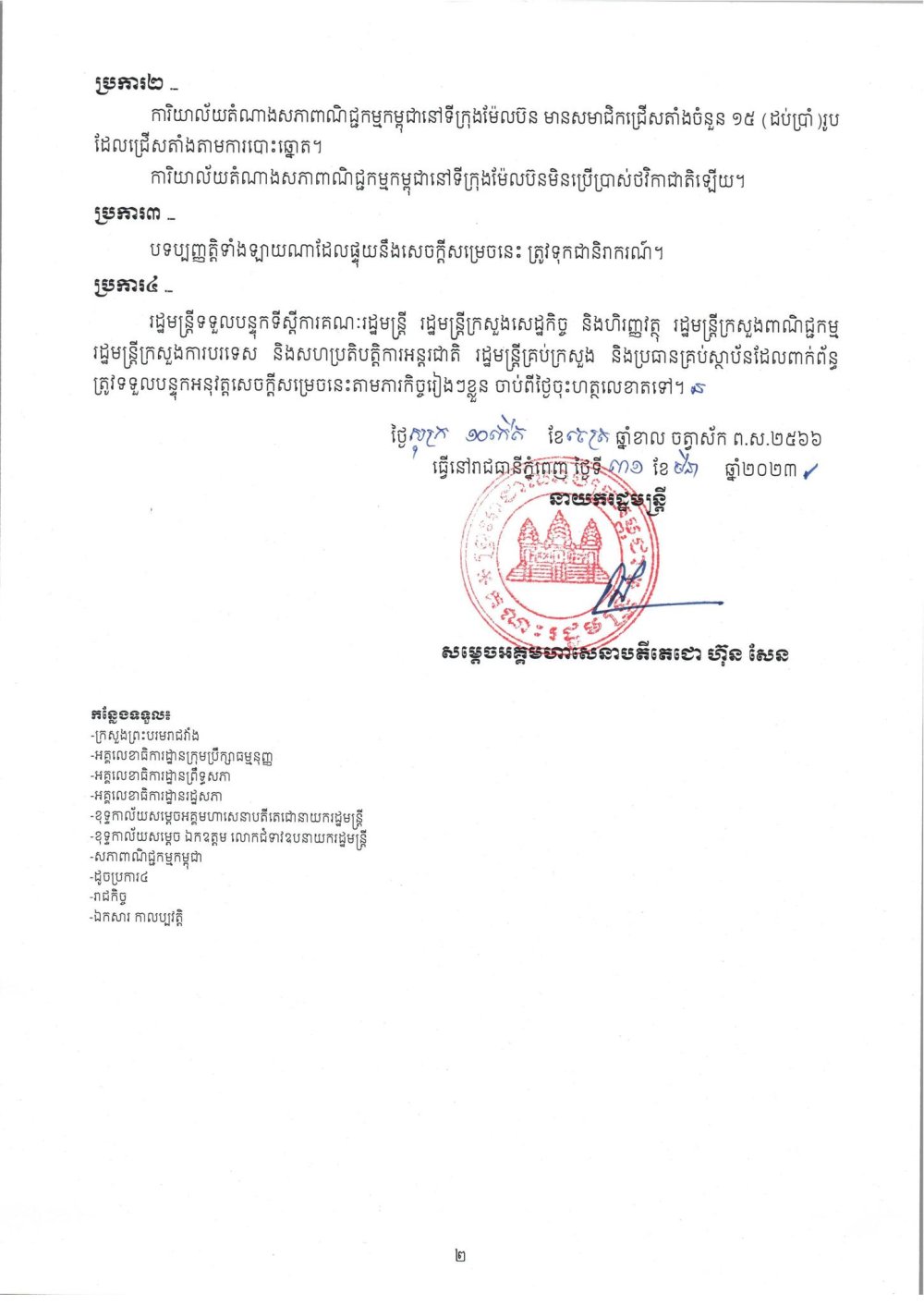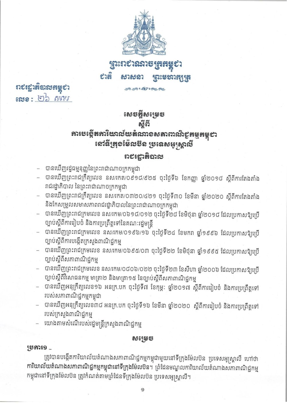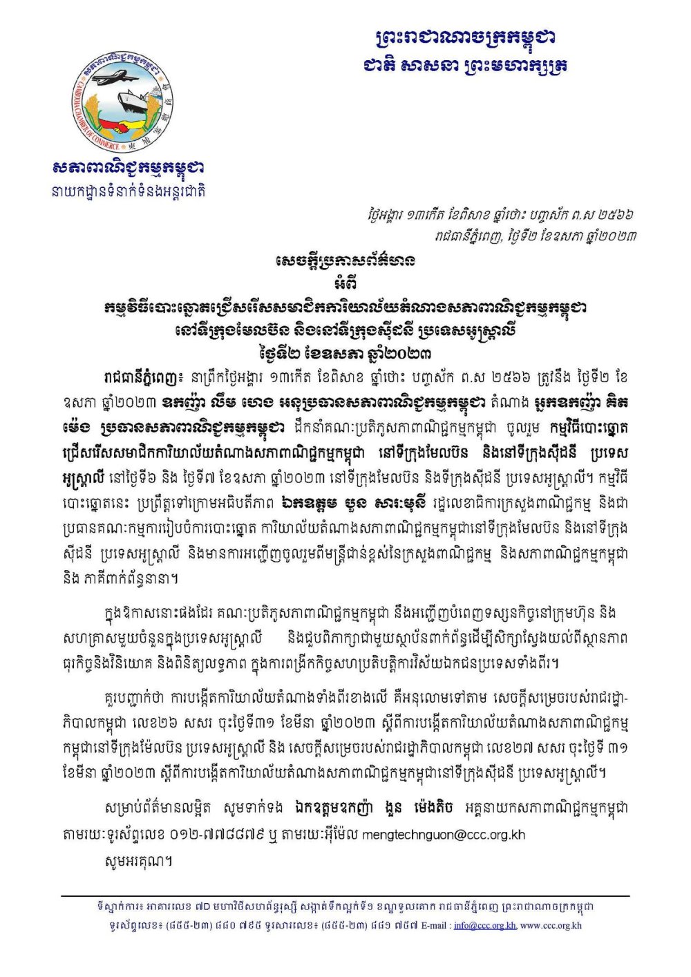 រាជធានីភ្នំពេញ៖ នាព្រឹកថ្ងៃអង្គារ ១៣កើត ខែពិសាខ ឆ្នាំថោះ បញ្ចស័ក ព.ស ២៥៦៦ ត្រូវនឹង ថ្ងៃទី២ ខែ ឧសភា ឆ្នាំ២០២៣ ឧកញ៉ា លឹម ហេង អនុប្រធានសភាពាណិជ្ជកម្មកម្ពុជា តំណាង អ្នកឧកញ៉ា គិត ម៉េង ប្រធានសភាពាណិជ្ជកម្មកម្ពុជា ដឹកនាំគណៈប្រតិភូសភាពាណិជ្ជកម្មកម្ពុជា ចូលរួម កម្មវិធីបោះឆ្នោតជ្រើសរើសសមាជិកការិយាល័យតំណាងសភាពាណិជ្ជកម្មកម្ពុជា នៅទីក្រុងមែលប៊ន និងនៅទីក្រុងស៊ីដនី ប្រទេសអូស្រ្តាលី នៅថ្ងៃទី៦ និង ថ្ងៃទី៧ ខែឧសភា ឆ្នាំ២០២៣ នៅទីក្រុងមែលប៊ន និងទីក្រុងស៊ីដនី ប្រទេសអូស្ត្រាលី។ កម្មវិធី