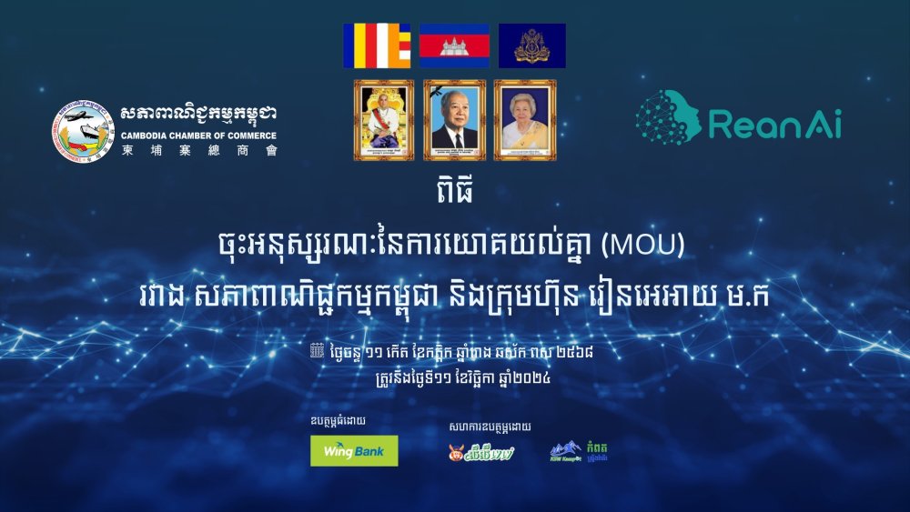 (រាជធានីភ្នំពេញ)៖ ថ្ងៃចន្ទ ១១កើត ខែកត្តិក ឆ្នាំរោង ឆស័ក ព.ស. ២៥៦៨ ត្រូវនឹងថ្ងៃទី១១ ខែវិច្ឆិកា ឆ្នាំ២០២៤ សភាពាណិជ្ជកម្មកម្ពុជា និង ក្រុមហ៊ុន រៀន អេអាយ ម.ក. បានចុះ អនុស្សរណៈនៃការយោគយល់គ្នា (MOU) ស្តីពី «កិច្ចសហប្រតិបត្តិការលើការលើកកម្ពស់ការយល់ដឹង និងជំរុញការចូលរួម ការប្រើប្រាស់បច្ចេកវិទ្យាបញ្ញាសិប្បនិមិត្ត (AI)» នៅអគ្គនាយកដ្ឋានសភាពាណិជ្ជកម្មកម្ពុជា។