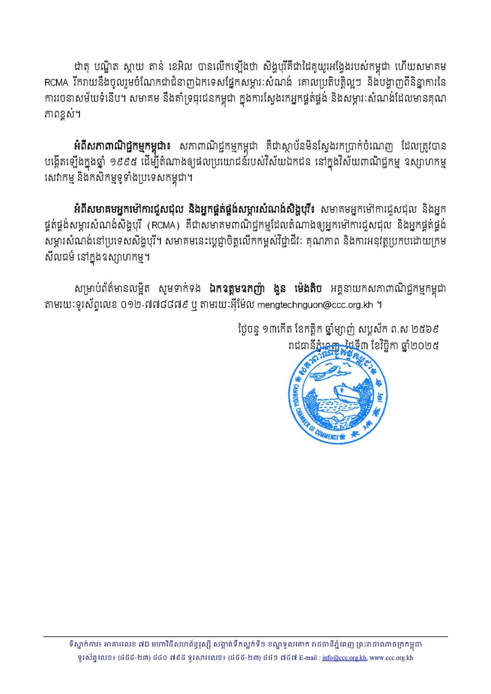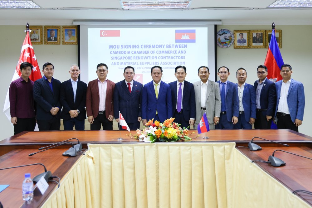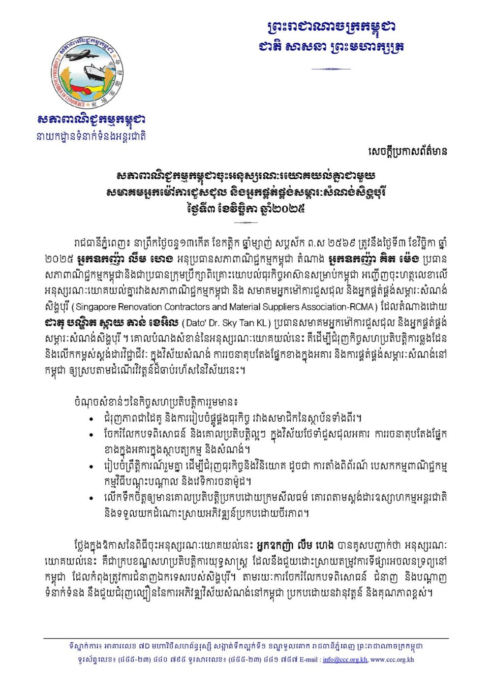 រាជធានីភ្នំពេញ៖ នាព្រឹកថ្ងៃចន្ទ១៣កើត ខែកត្តិក ឆ្នាំម្សាញ់ សប្តស័ក ព.ស ២៥៦៩ ត្រូវនឹងថ្ងៃទី៣ ខែវិច្ឆិកា ឆ្នាំ២០២៥ អ្នកឧកញ៉ា លឹម ហេង អនុប្រធានសភាពាណិជ្ជកម្មកម្ពុជា តំណាង អ្នកឧកញ៉ា គិត ម៉េង ប្រធានសភាពាណិជ្ជកម្មកម្ពុជានិងជាប្រធានក្រុមប្រឹក្សាពិគ្រោះយោបល់ធុរកិច្ចអាស៊ានសម្រាប់កម្ពុជា អញ្ជើញចុះហត្ថលេខាលើអនុស្សរណៈយោគយល់គ្នារវាងសភាពាណិជ្ជកម្មកម្ពុជា និង សមាគមអ្នកម៉ៅការជួសជុល និងអ្នកផ្គត់ផ្គង់សម្ភារៈសំណង់សិង្ហបុរី (Singapore Renovation Contractors and Material Suppliers Association-RCMA) ដែលតំណាងដោយ ដាតុ បណ្ឌិត ស្កាយ តាន់ ខេអិល (Dato' Dr. Sky Tan KL) ប្រធានសមាគមអ្នកម៉ៅការជួសជុល និងអ្នកផ្គត់ផ្គង់សម្ភារៈសំណង់សិង្ហបុរី ។ គោលបំណងសំខាន់នៃអនុស្សរណៈយោគយល់នេះ គឺដើម្បីជំរុញកិច្ចសហប្រតិបត្តិការឆ្លងដែន និងលើកកម្ពស់ស្តង់ដារវិជ្ជាជីវៈ ក្នុងវិស័យសំណង់ ការរចនាតុបតែងផ្នែកខាងក្នុងអគារ និងការផ្គត់ផ្គង់សម្ភារៈសំណង់នៅកម្ពុជា ឲ្យស្របតាមដំណើរវិវត្តន៍ដ៏ឆាប់រហ័សនៃវិស័យនេះ។