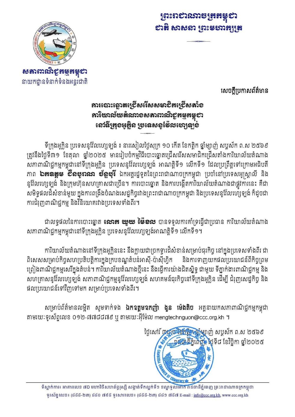ទីក្រុងអូក្លិន ប្រទេសនូវ៉ែលហ្សេឡង់ ៖ នារសៀលថ្ងៃសុក្រ ១០ កើត ខែកត្តិក ឆ្នាំម្សាញ់ សប្ដស័ក ព.ស ២៥៦៩ ត្រូវនឹងថ្ងៃទី៣១ ខែតុលា ឆ្នាំ២០២៥ មាន រៀបចំ កម្ម វិធីបោះឆ្នោត ជ្រើសរើស សមាជិក ជ្រើសតាំង ការិយាល័យ តំណាង សភាពាណិជ្ជកម្ម កម្ពុជា នៅទីក្រុង អូក្លិន ប្រទេស នូវ៉ែល ហ្សេឡង់ អាណត្តិទី១ លើកទី១ ដែល ប្រព្រឹត្តទៅ ក្រោម អធិបតីភាព ឯកឧត្តម ជឺនបូរាណ ច័ន្ទបុរី ឯកអគ្គរដ្ឋទូតនៃព្រះរាជាណាចក្រកម្ពុជា ប្រចាំនៅប្រទេសអូស្ត្រាលី និង