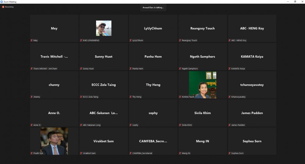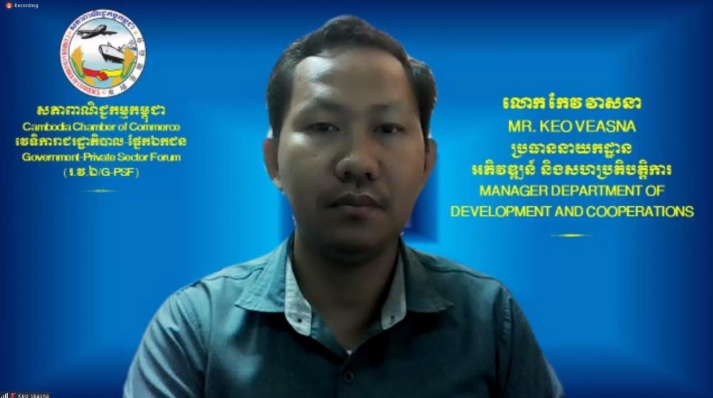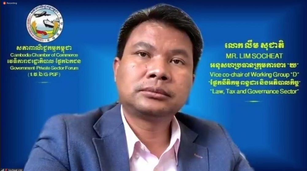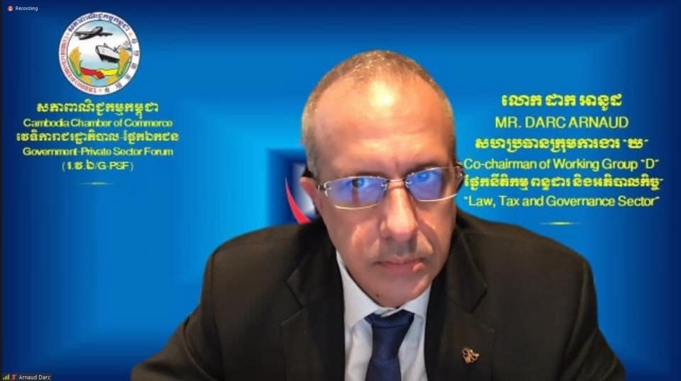 ថ្ងៃព្រហស្បតិ៍ ០៧កើត ខែកត្កិក ឆ្នាំឆ្លូវ ត្រីស័ក ព.ស ២៥៦៥ ត្រូវនឹងថ្ងៃទី១១ ខែវិច្ឆិកា ឆ្នាំ២០២១ វេលាម៉ោង ១០:០០ នាទីព្រឹក មានរៀបចំកិច្ចប្រជុំពិភាក្សាក្រុមការងារ “ឃ” “ផ្នែកនីតិកម្ម ពន្ធដារ និងអភិបាលកិច្ច” ផ្នែកឯកជន នៃវេទិការាជរដ្ឋាភិបាល-ផ្នែកឯកជន តាមប្រព័ន្ធវីដេអូអនឡាញ Zoom ក្រោមអធិបតីភាព លោក អានូដ ដាក សហប្រធានក្រុមការងារ “ឃ” ផ្នែកឯកជន។ កិច្ចប្រជុំនេះ ក៏មានការចូលរួមផងដែរពីសំណាក់ ឯកឧត្តម ឧកញ៉ា ងួន ម៉េងតិច អគ្គនាយកសភាពាណិជ្ជកម្មកម្ពុជា និងវត្តមានអនុសហប្រធានក្រុមការងារ “ឃ” ផ្នែកឯកជន, សមាជិក សមាជិកា សភាពាណិជ្ជកម្មកម្ពុជា, តំណាងសភាពាណិជ្ជកម្មអឺរ៉ុប, តំណាងសមាគមកាត់ដេរកម្ពុជា, តំណាងសភាពាណិជ្ជកម្មអន្តរជាតិ, ក្រុមហ៊ុនឯកជន, និងសមាជិក សមាជិកានៃក្រុមការងារ “ឃ”ជាច្រើនទៀតផងដែរ។