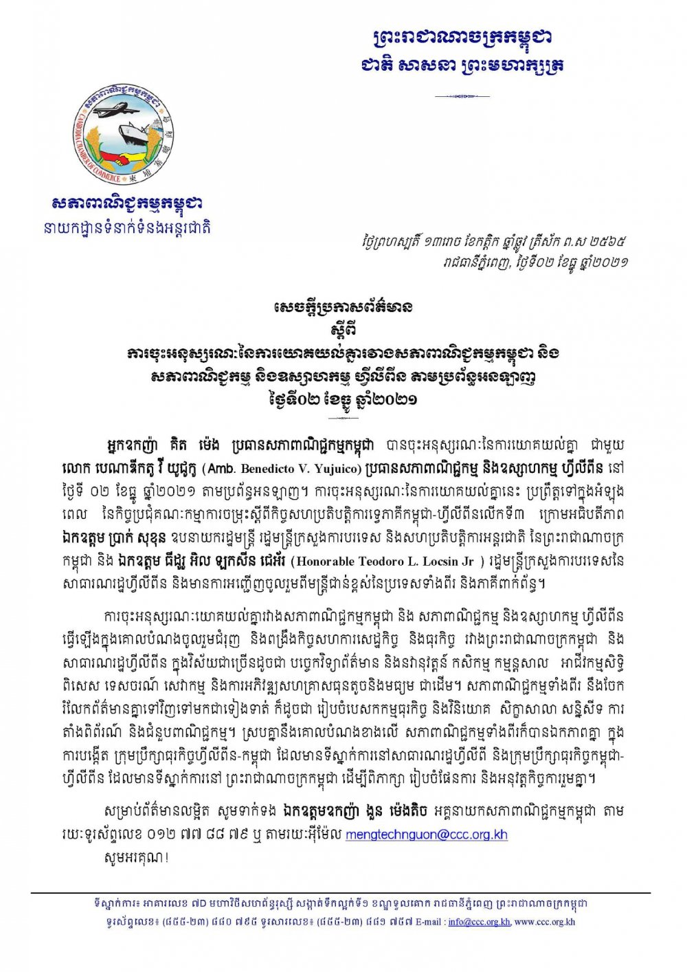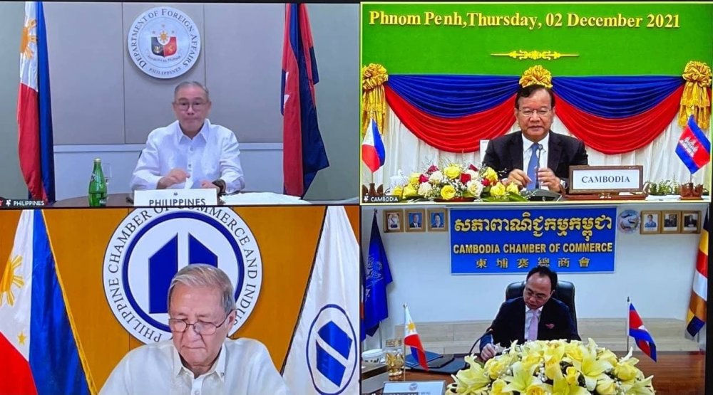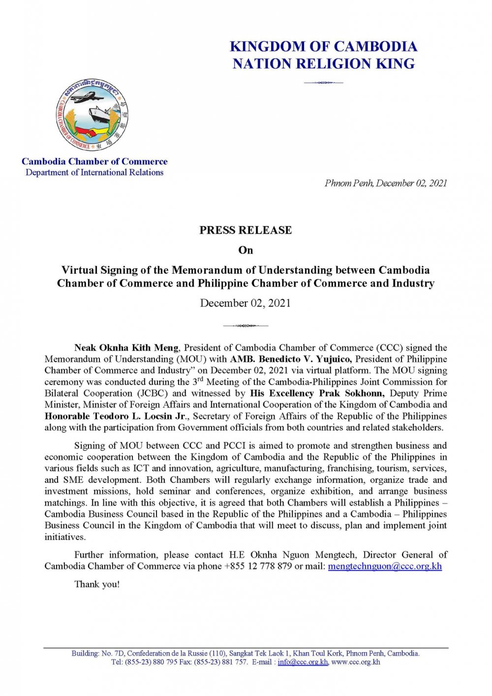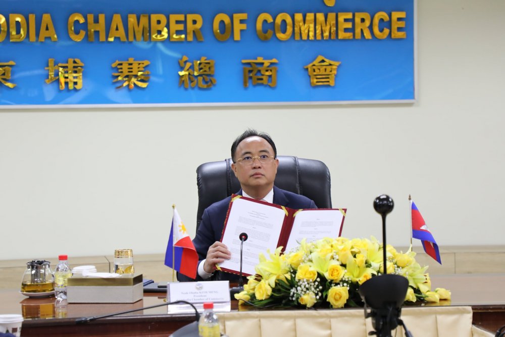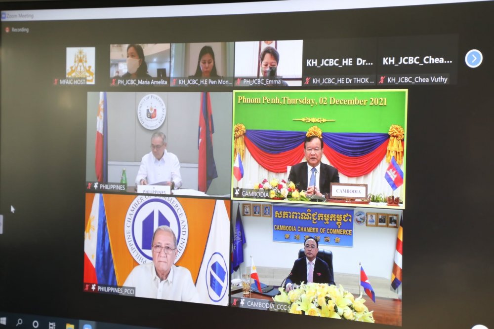 Neak Oknha Kith Meng, President of Cambodia Chamber of Commerce (CCC) signed the Memorandum of Understanding (MOU) with AMB. Benedicto V. Yujuico, President of Philippine Chamber of Commerce and Industry” on December 02, 2021 via virtual platform. The MOU signing ceremony was conducted during the 3rd Meeting of the Cambodia-Philippines Joint Commission for Bilateral Cooperation (JCBC) and witnessed by His Excellency Prak Sokhonn, Deputy Prime Minister, Minister of Foreign Affairs and International Cooperation of the Kingdom of Cambodia and Honorable Teodoro L. Locsin Jr., Secretary of Foreign Affairs of the Republic of the Philippines along with the participation from High-Ranking Government officials from both countries and related stakeholders.