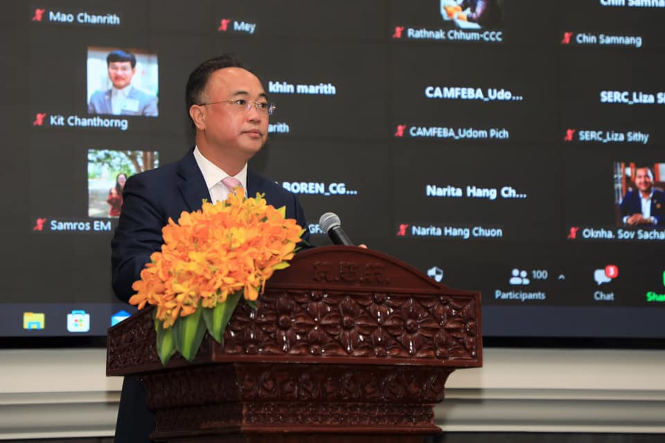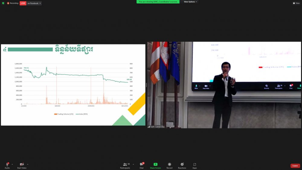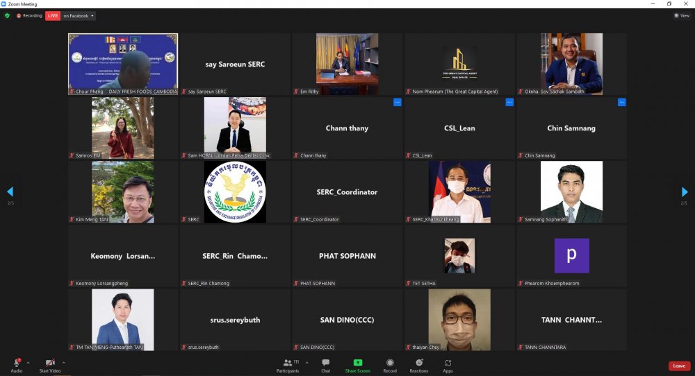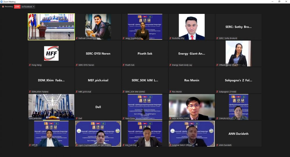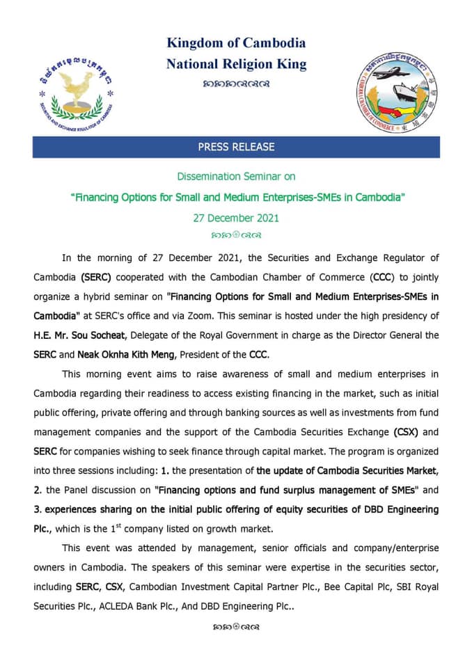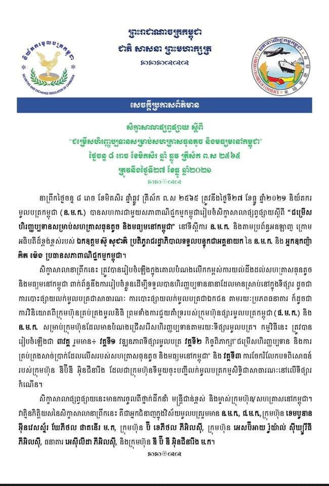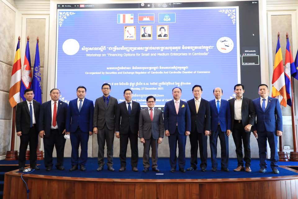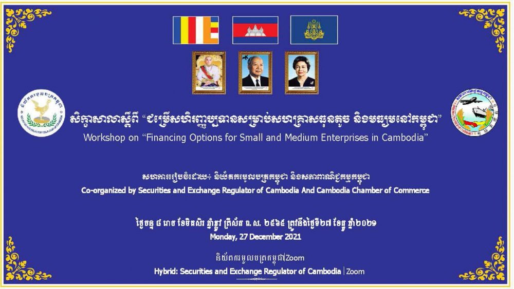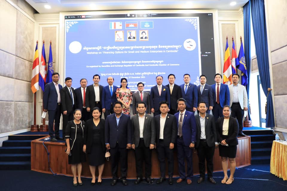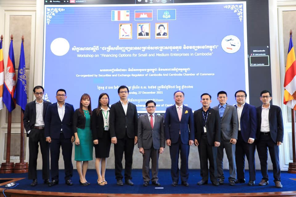 នាព្រឹកថ្ងៃចន្ទ ៨ រោច ខែមិគសិរ ឆ្នាំឆ្លូវ ត្រីស័ក ព.ស ២៥៦៥ ត្រូវនឹងថ្ងៃទី២៧ ខែធ្នូ ឆ្នាំ២០២១ អ្នកឧកញ៉ា គិត ម៉េង ប្រធានសភាពាណិជ្ជកម្មកម្ពុជាបានអញ្ជើញចូលរួមជាអធិបតី និងថ្លែងមតិស្វាគមន៍ ក្នុងសិក្ខាសាលាផ្សព្វផ្សាយស្ដីពី “ជម្រើសហិរញ្ញប្បទានសម្រាប់សហគ្រាសធុនតូច និងមធ្យមនៅកម្ពុជា” ដែលជាការសហការគ្នារវាងសភាពាណិជ្ជកម្មកម្ពុជា ជាមួយនិងនិយ័តករមូលបត្រកម្ពុជា (ន. ម.ក.) នៅទីស្តីការនិយ័តករមូលបត្រកម្ពុជា (ន. ម.ក.) និងតាមប្រព័ន្ធអនឡាញ ZOOM ក្រោមអធិបតីភាព ឯកឧត្តម ស៊ូ សុជាតិ ប្រតិភូរាជរដ្ឋាភិបាលទទួលបន្ទុកជាអគ្គនាយកនិយ័តករមូលបត្រកម្ពុជា នៃ (ន. ម.ក.)។ សិក្ខាសាលាផ្សព្វផ្សាយនេះក៏មានការចូលពីសំណាក់អនុប្រធានសភាពាណិជ្ជកម្មកម្ពុជា សមាជិក សមាជិការសភាពាណិជ្ជកម្មកម្ពុជា ថ្នាក់ដឹកនាំ មន្ត្រីជាន់ខ្ពស់នៃនិយ័តករមូលបត្រកម្ពុជា និងម្ចាស់ក្រុមហ៊ុន សហគ្រាសនៅកម្ពុជាជាច្រើនទៀតផងដែរ។