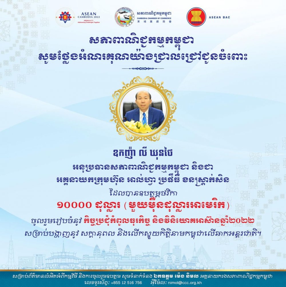 សភាពាណិជ្ជកម្មកម្ពុជា សូមថ្លែងអំណរគុណយ៉ាងជ្រាលជ្រៅជូនចំពោះ ឧកញ៉ា លី ឃុនថៃ អនុប្រធានសភាពាណិជ្ជកម្មកម្ពុជា និងជាអគ្គនាយកក្រុមហ៊ុន អាល់ហ្វា ប្រផឹធី ខនស្ត្រាក់សិន ដែលបានឧបត្ថម្ភថវិកា ១០០០០ ដុល្លារ (មួយម៉ឺនដុល្លារអាមេរិក) ចូលរួមរៀបចំ កិច្ចប្រជុំកំពូលធុរកិច្ច និងវិនិយោគអាស៊ានឆ្នាំ២០២២ ដែលជាកម្លាំងសាមគ្គីក្នុងការរួមចំណែកលើកស្ទួយកិត្តិនាមកម្ពុជាលើឆាកអន្តរជាតិ។