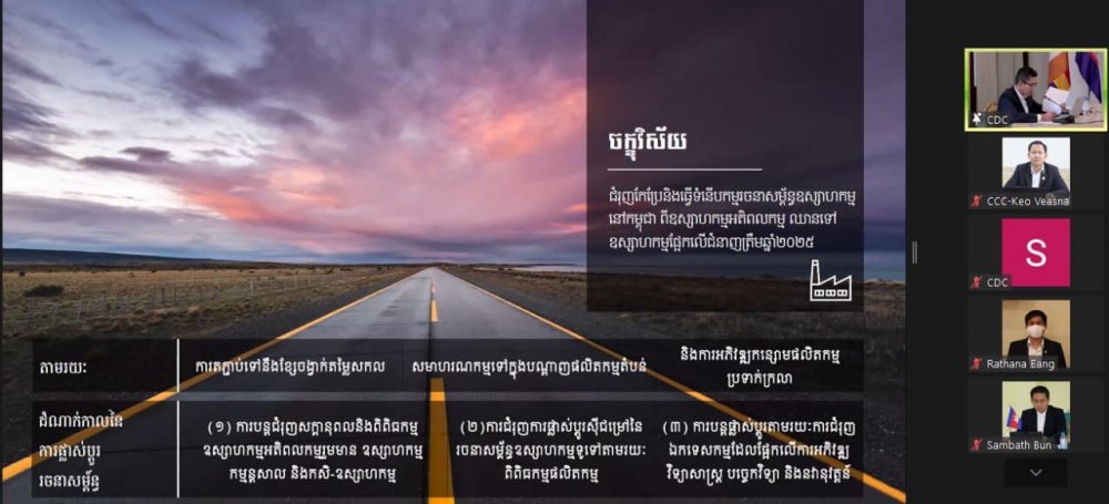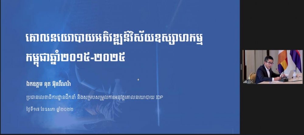 នាព្រឹកថ្ងៃអង្គារ ២រោច ខែពិសាខ ឆ្នាំខាល ចត្វាស័ក ព.ស.២៥៦៦ ត្រូវនឹងថ្ងៃទី១៧ ខែឧសភា ឆ្នាំ២០២២ ក្រុមប្រឹក្សាអភិវឌ្ឍន៍កម្ពុជា (ក.អ.ក.) វេលាម៉ោង ៩:០០នាទីព្រឹក ប្រធានាយកដ្ឋានអភិវឌ្ឍន៍ និងសហប្រតិបត្តិការ នៃសភាពាណិជ្ជកម្មកម្ពុជា តំណាងដ៏ខ្ពង់ខ្ពស់ ឯកឧត្តម ឧកញ៉ា ងួន ម៉េងតិច អគ្គនាយកសភាពាណិជ្ជកម្មកម្ពុជា បានចូលរួមក្នុងសិក្ខាសាលាផ្សព្វផ្សាយរបាយការណ៍វាយតម្លៃពាក់កណ្តាលអាណត្តិនៃការអនុវត្តគោលនយោបាយអភិវឌ្ឍន៍វិស័យឧស្សាហកម្មកម្ពុជា ឆ្នាំ២០១៥-២០២៥ (IDP MTR) តាមប្រព័ន្ធអនឡាញ ក្រោមអធិបតីភាពរបស់ឯកឧត្ដម ជិន ប៊ុនស៊ាន ទេសរដ្ឋមន្ត្រីទទួលបន្ទុកបេសកកម្មពិសេស អនុប្រធាន ក.អ.ក. និងវត្តមាន ឯកឧត្តម សុខ ចិន្តាសោភា រដ្ឋមន្ត្រីប្រតិភូអមនាយករដ្ឋមន្ត្រី និងជាអគ្គលេខាធិការ ក.អ.ក. និងមានការចូលរួមពី ឯកឧត្តម លោកជំទាវ លោក លោកស្រី ជាតំណាងក្រសួង ស្ថាប័នថ្នាក់ជាតិ និងរដ្ឋបាលថ្នាក់ក្រោមជាតិ អ្នកជំនាញការ តំណាងសមាគមវិនិយោគិន និងសភាធុរកិច្ចបរទេសនៅកម្ពុជា និងដៃគូអភិវឌ្ឍន៍ សរុបចំនួនប្រមាណ ៥០រូប។
