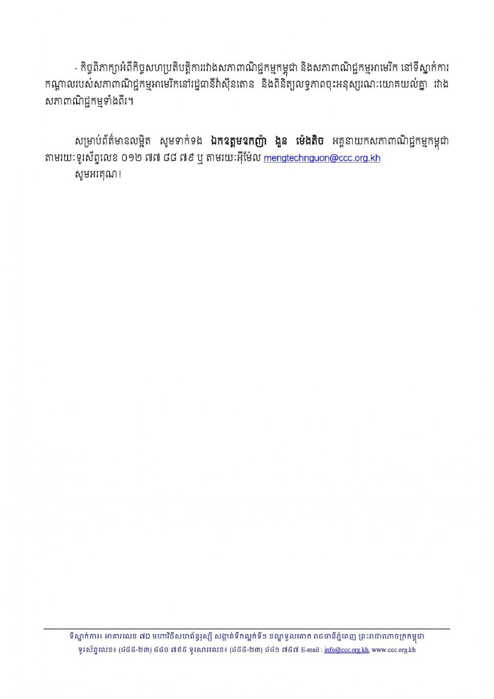 - កិច្ចពិភាក្សាអំពីកិច្ចសហប្រតិបត្តិការរវាងសភាពាណិជ្ជកម្មកម្ពុជា និងសភាពាណិជ្ជកម្មអាមេរិក នៅទីស្នាក់ការកណ្តាលរបស់សភាពាណិជ្ជកម្មអាមេរិកនៅរដ្ឋធានីវ៉ាស៊ីនតោន និងពិនិត្យលទ្ធភាពចុះអនុស្សរណៈយោគយល់គ្នា រវាងសភាពាណិជ្ជកម្មទាំងពីរ។