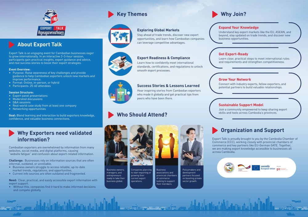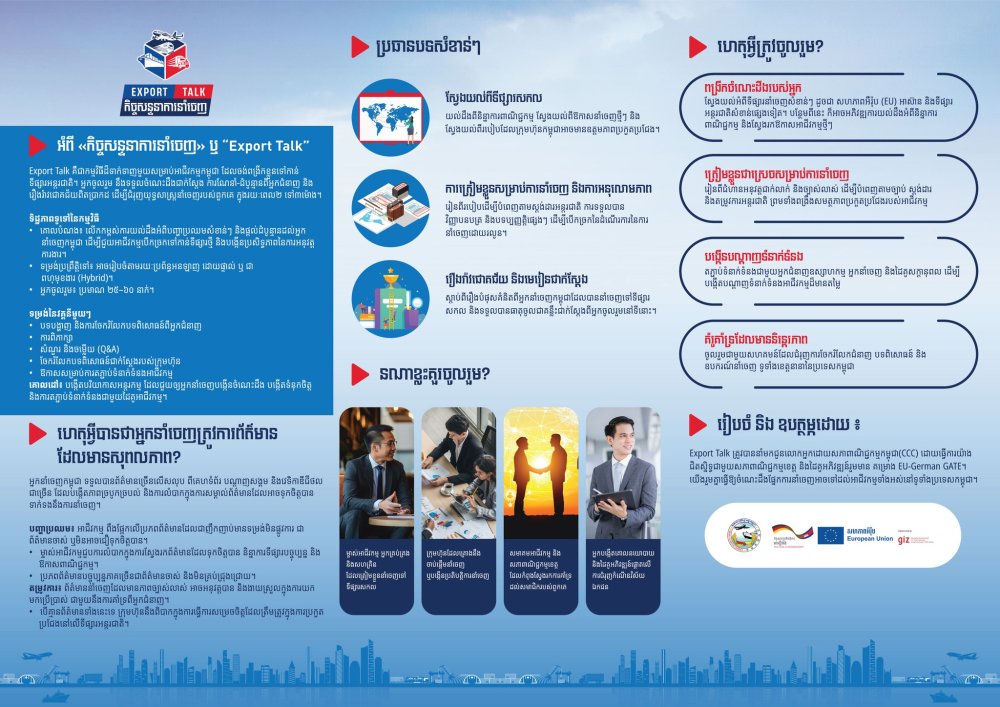 សូមជម្រាបថានេះជាកិច្ចសន្ទនាការនាំចេញលើកទី១ ហើយ សភាពាណិជ្ជកម្មកម្ពុជា នឹងរៀបចំកិច្ចសន្ទនាការនាំចេញជាបន្តរបន្ទាប់ទៀត ក្នុងការជួយគាំទ្រ ដល់ សមាជិក សមាជិកា សភាពាណិជ្ជកម្មកម្ពុជា។