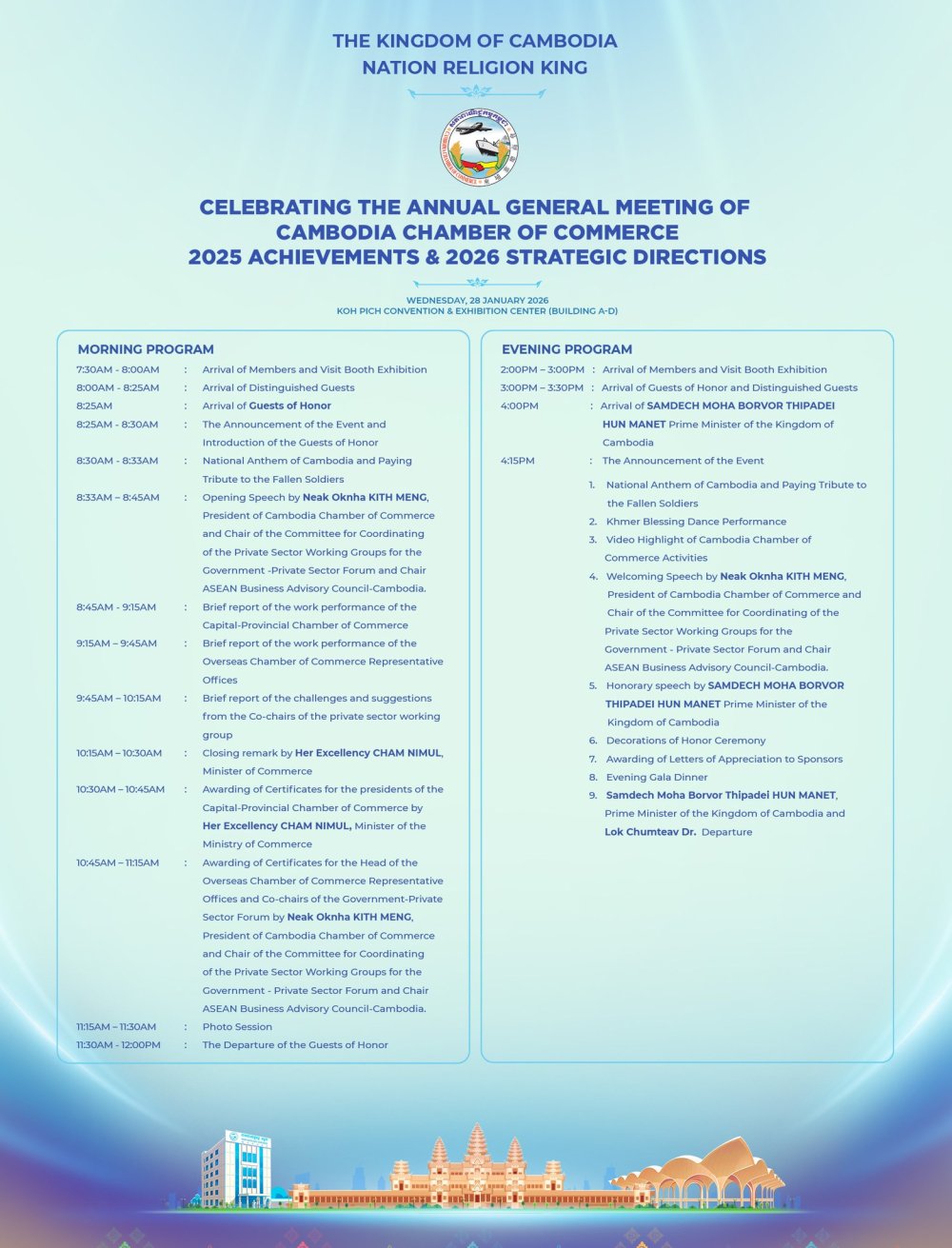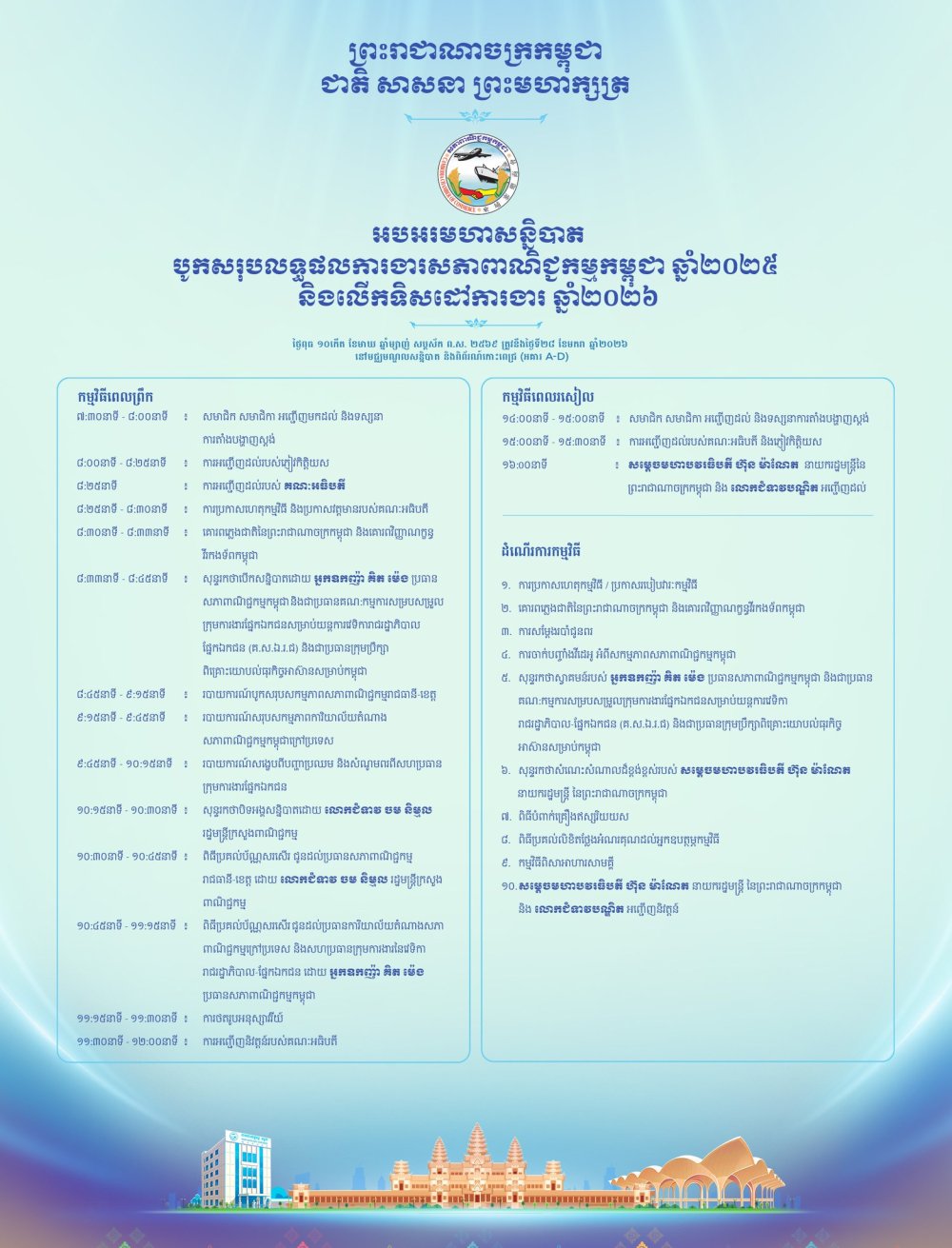 សភាពាណិជ្ជកម្មកម្ពុជា មានកិត្តិយស សូមគោរពអញ្ជើញ សមាជិក សមាជិកា សភាពាណិជ្ជកម្មកម្ពុជាទាំងអស់ អញ្ជើញចូលរួមពិធី «អបអរមហាសន្និបាតបូកសរុបលទ្ធផលការងារសភាពាណិជ្ជកម្មកម្ពុជាឆ្នាំ២០២៥ និងលើកទិសដៅការងារឆ្នាំ២០២៦» ដែលនេះជាព្រឹត្តិការណ៍ជួបជុំដ៏ធំប្រចាំឆ្នាំនៃមហាគ្រួសារសភាពាណិជ្ជកម្មកម្ពុជា ក្នុងគោលបំណងជួបជុំ សមាជិក សមាជិកា សភាពាណិជ្ជកម្មកម្ពុជានៅក្នុងប្រទេស និងតំណាងការិយាល័យសភាពាណិជ្ជកម្មកម្ពុជានៅក្រៅប្រទេសទាំងអស់។