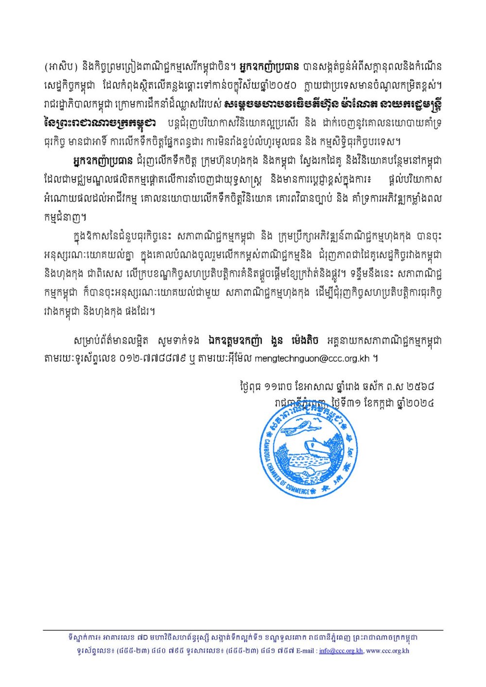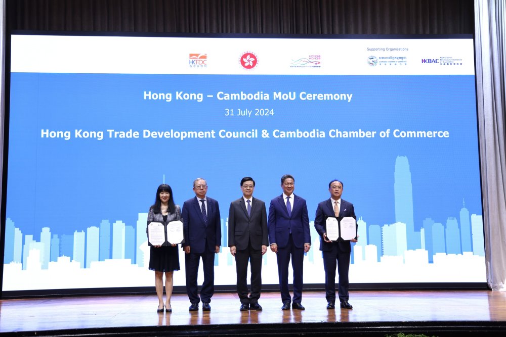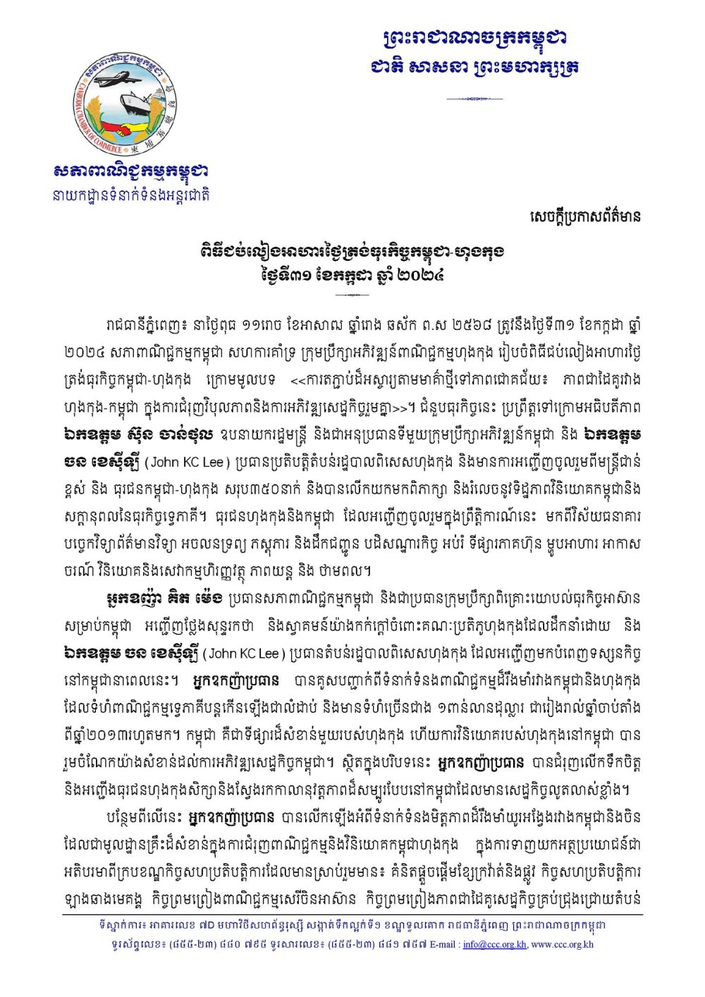 រាជធានីភ្នំពេញ៖ នាថ្ងៃពុធ ១១រោច ខែអាសាឍ ឆ្នាំរោង ឆស័ក ព.ស ២៥៦៨ ត្រូវនឹងថ្ងៃទី៣១ ខែកក្កដា ឆ្នាំ២០២៤ សភាពាណិជ្ជកម្មកម្ពុជា សហការគាំទ្រ ក្រុមប្រឹក្សាអភិវឌ្ឍន៍ពាណិជ្ជកម្មហុងកុង រៀបចំពិធីជប់លៀងអាហារថ្ងៃត្រង់ធុរកិច្ចកម្ពុជា-ហុងកុង ក្រោមមូលបទ <<ការតភ្ជាប់ដ៏អស្ចារ្យតាមមាគ៌ាថ្មីទៅភាពជោគជ័យ៖ ភាពជាដៃគូរវាង
