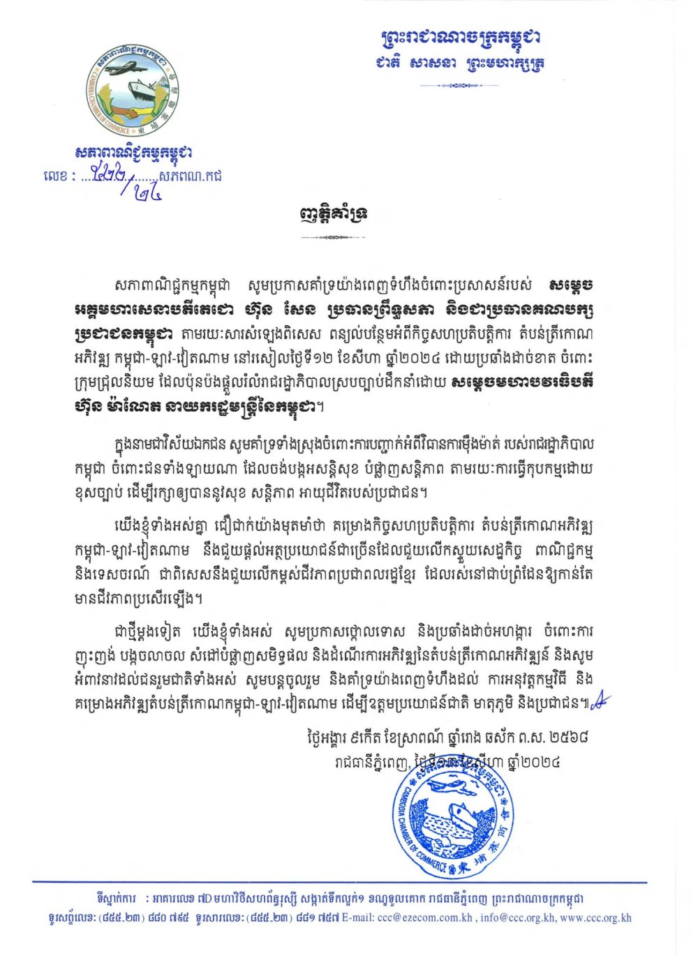 ញត្តិគាំទ្រ របស់ សភាពាណិជ្ជកម្មកម្ពុជា គាំទ្រយ៉ាងពេញទំហឹងចំពោះប្រសាសន៍របស់ សម្តេច អគ្គមហាសេនាបតីតេជោ ហ៊ុន សែន ប្រធានព្រឹទ្ធសភា និងជាប្រធានគណបក្សប្រជាជនកម្ពុជា តាមរយៈសារសំឡេងពិសេស ពន្យល់បន្ថែមអំពីកិច្ចសហប្រតិបត្តិការ តំបន់ត្រីកោណអភិវឌ្ឍ កម្ពុជា-ឡាវ-វៀតណាម នៅរសៀលថ្ងៃទី១២ ខែសីហា ឆ្នាំ២០២៤។