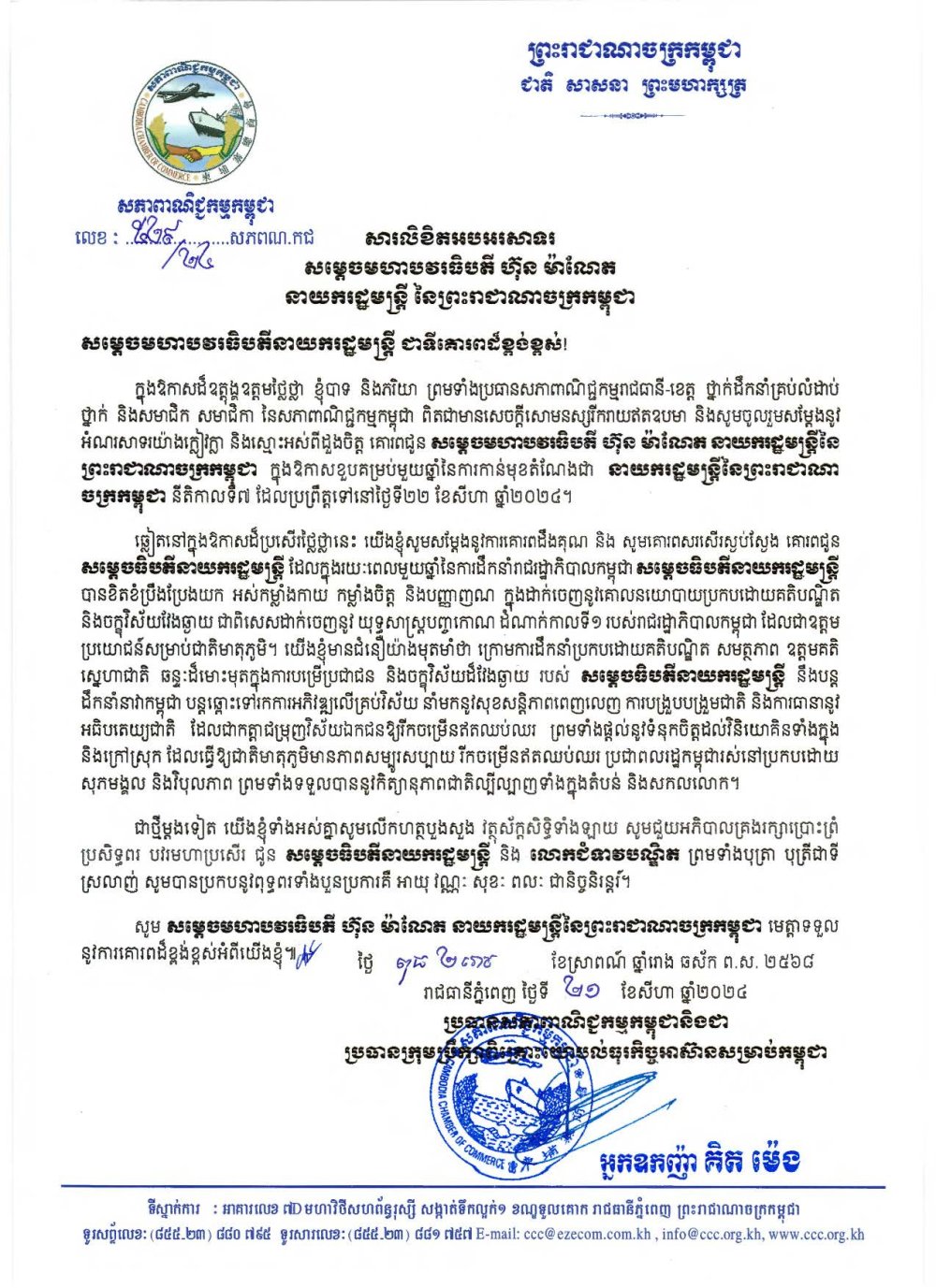 ក្នុងឱកាសដ៏ឧត្តុង្គឧត្តមថ្លៃថ្លា អ្នកឧកញ៉ា គិត ម៉េង ប្រធានសភាពាណិជ្ជកម្មកម្ពុជា និងជាប្រធានក្រុមប្រឹក្សាពិគ្រោះយោបល់ធុរកិច្ចអាស៊ានសម្រាប់កម្ពុជា និងលោកជំទាវ ព្រមទាំងប្រធានសភាពាណិជ្ជកម្មរាជធានី-ខេត្ត ថ្នាក់ដឹកនាំគ្រប់លំដាប់ថ្នាក់ និងសមាជិក សមាជិកា នៃសភាពាណិជ្ជកម្មកម្ពុជា ពិតជាមានសេចក្តីសោមនស្សរីករាយឥតឧបមា និងសូមចូលរួមសម្តែងនូវអំណរសាទរយ៉ាងក្លៀវក្លា និងស្មោះអស់ពីដួងចិត្ត គោរពជូន សម្តេចធិបតីនាយករដ្ឋមន្រ្តីជាទីគោរពដ៏ខ្ពង់ខ្ពស់។